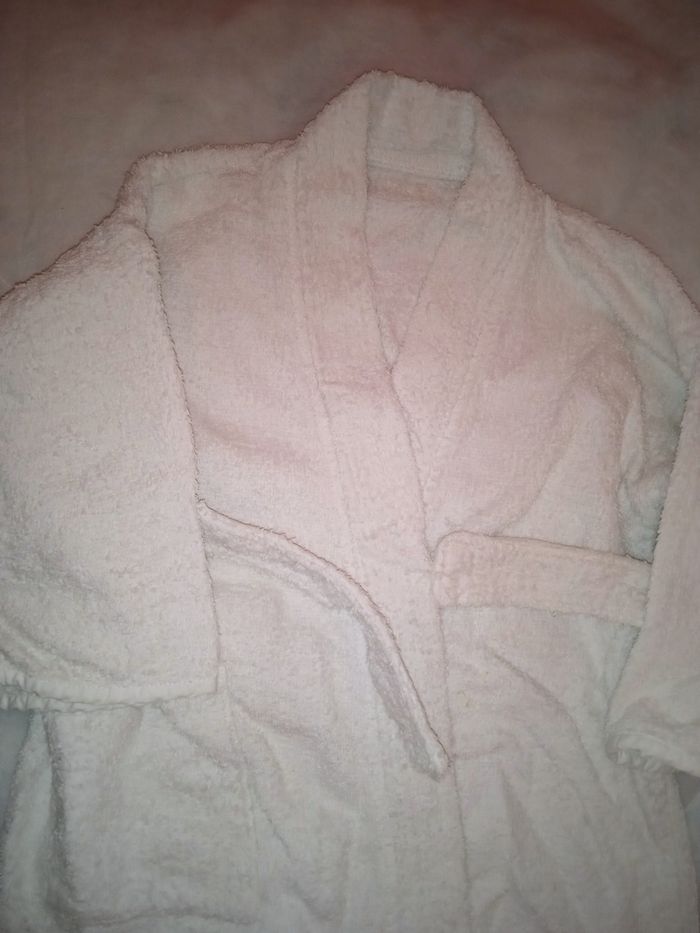 Peignoir éponge blanc Marque : Evian T. 1 an (pas d'étiquette mais ça correspond à cette taille-là) Bon état général