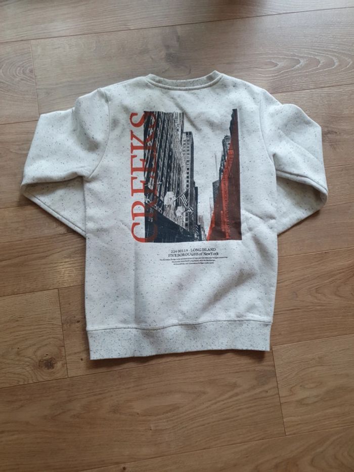 Pull creeks taille 164 cm soit S (14 ans ) Thème New York Blanc cassé tacheté Très bon état