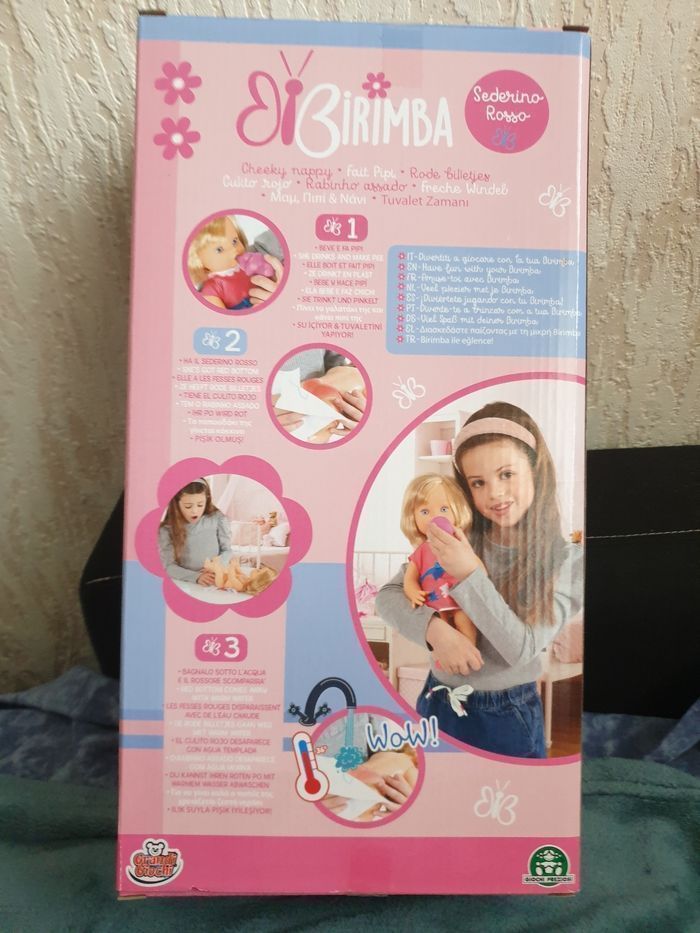 NEUF JAMAIS OUVERT Dés 2 ans Dimensions : H39x 19 x13 cm Poupée Birimba blonde aux yeux bleus Après avoir bu son biberon la poupée birimba fait pipi. Ces fesses deviennent toutes rouges tant que le bébé n'a pas été lavé ; dés que les fesses ont été nettoyées la rougeur s'estompe et les fesses retrouvent leur couleur normale Expédition rapide livré de France
