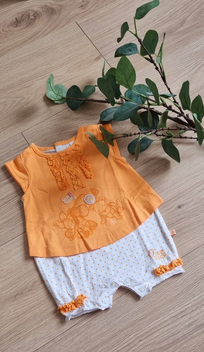 Lots 1 mois été de 8 pièces comprenant 1 barboteuse et chaussons Grain de blé 1 barboteuse disney 1 gilet Obaibi 1 gilet Bout'chou 1 ensemble débardeur, short et gilet kitchoun le tous en très bon état
