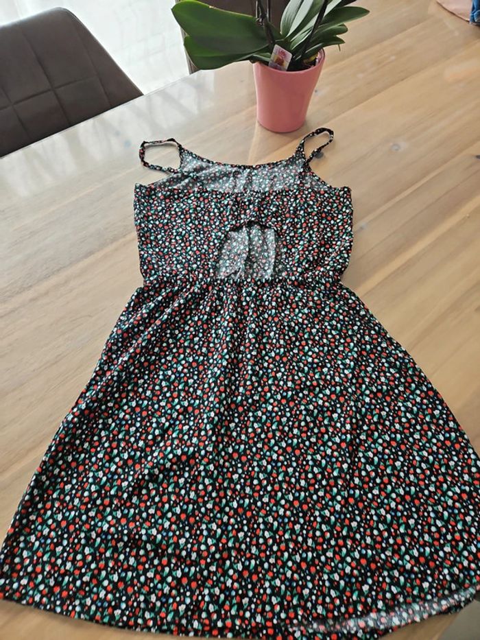 Robe kiabi Taille s soit 16 ans (156 164cm) En parfait état Noire à fleurs Un peu dos nu.( cf photo) Très girly et bien taillé