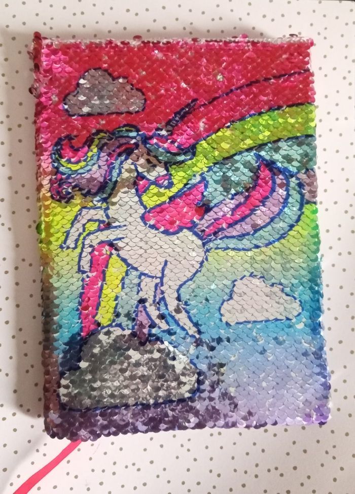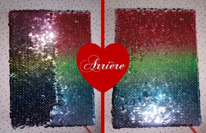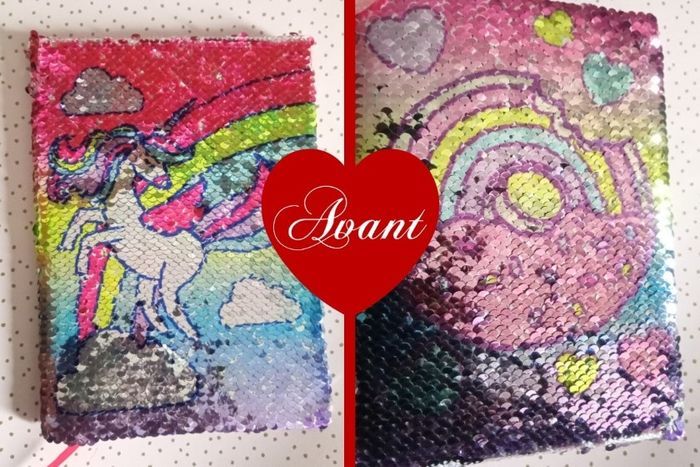 Un cahier intérieur ligne à couverture sequin réversible "paillettes vers le bas licorne , vers le haut donuts + une trousse licorne + un stylo + des post-it en forme de cœur + un marque-page 🦄 licorne