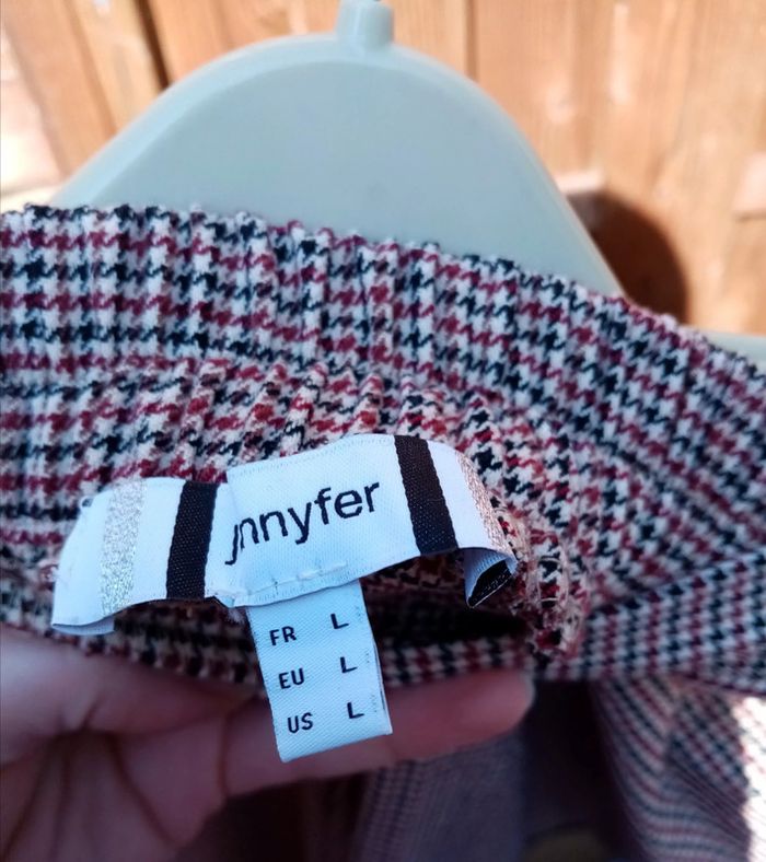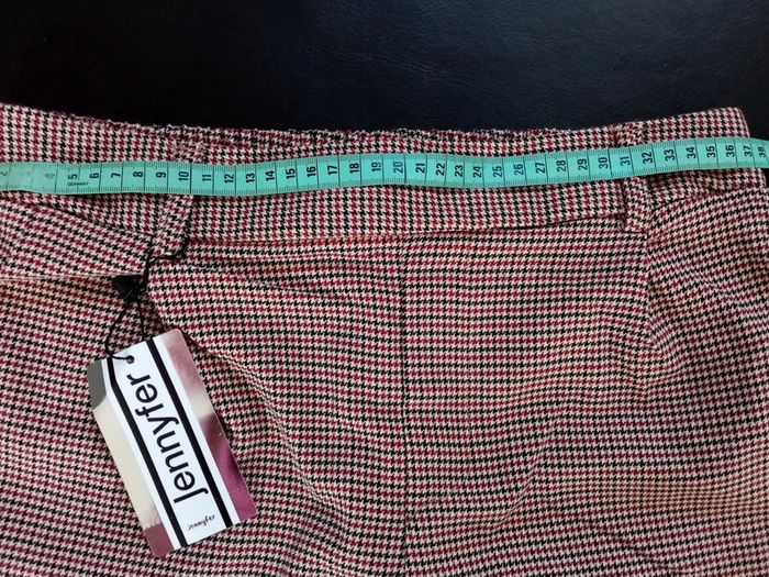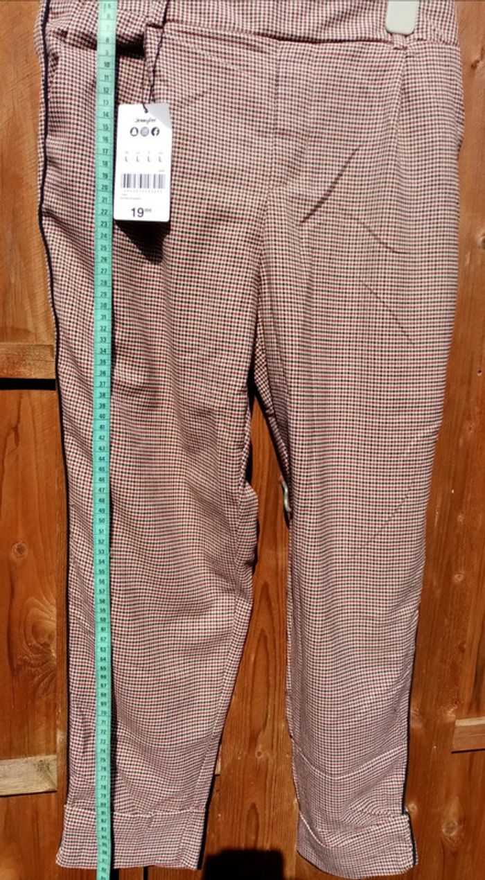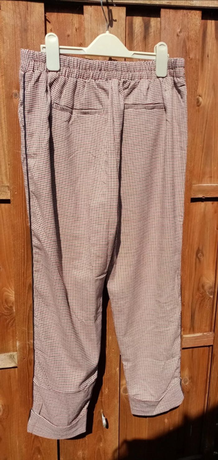 Pantalon 7/8 ème neuf. Élastique à la taille dans le dos, motif pied de poule bordeaux, noir et brun sur fond beige Liseré sur chaque côté du pantalon et revers au bas. Taille L Mesures en photos Si vous avez des questions n'hésitez pas #noisette5457_vetementsfemmesL