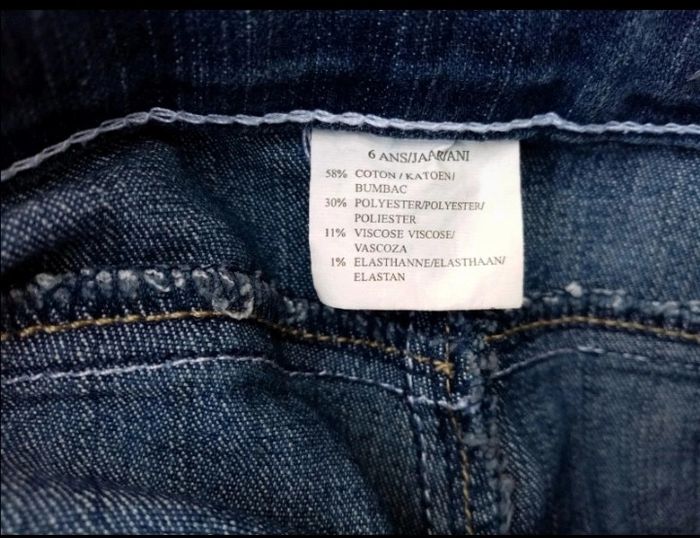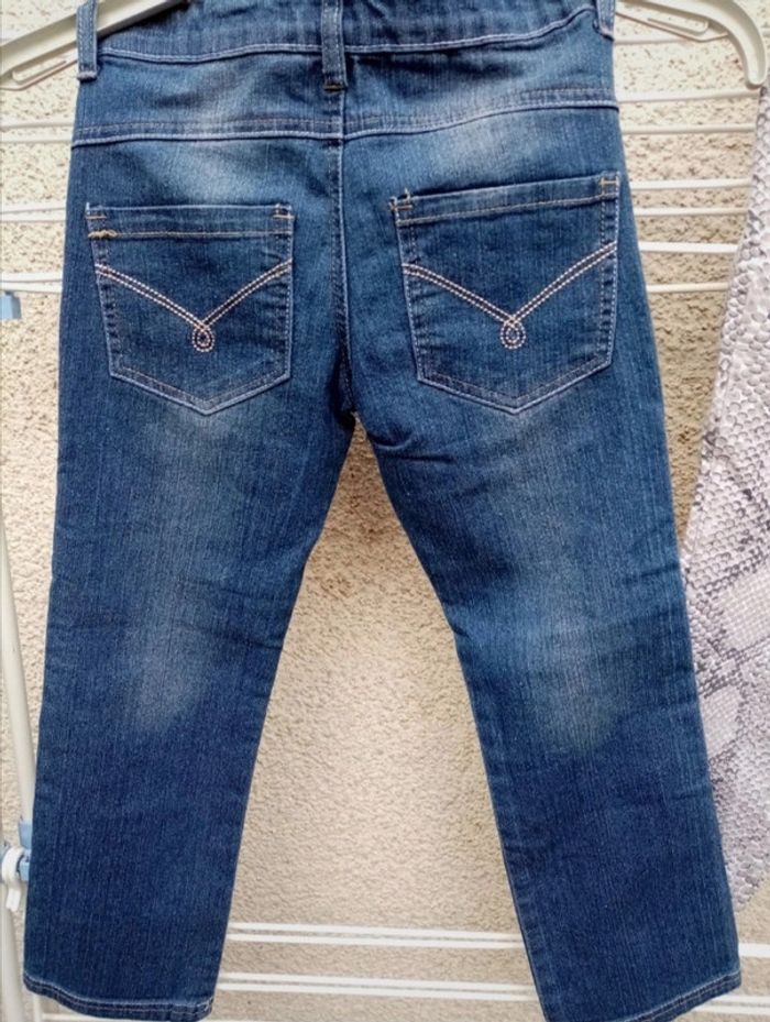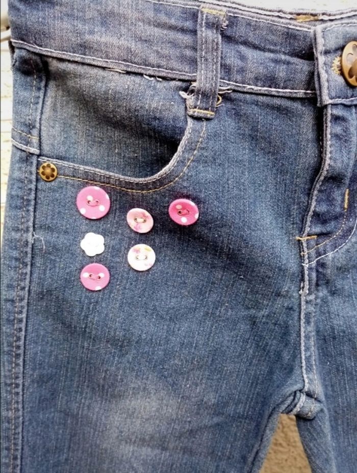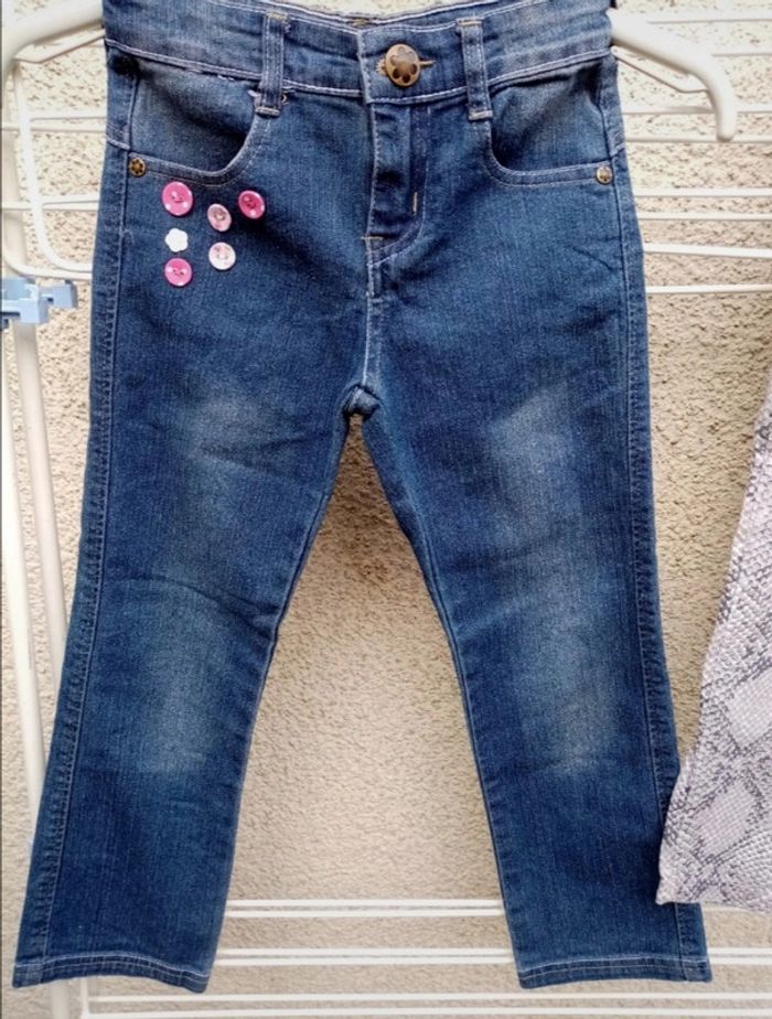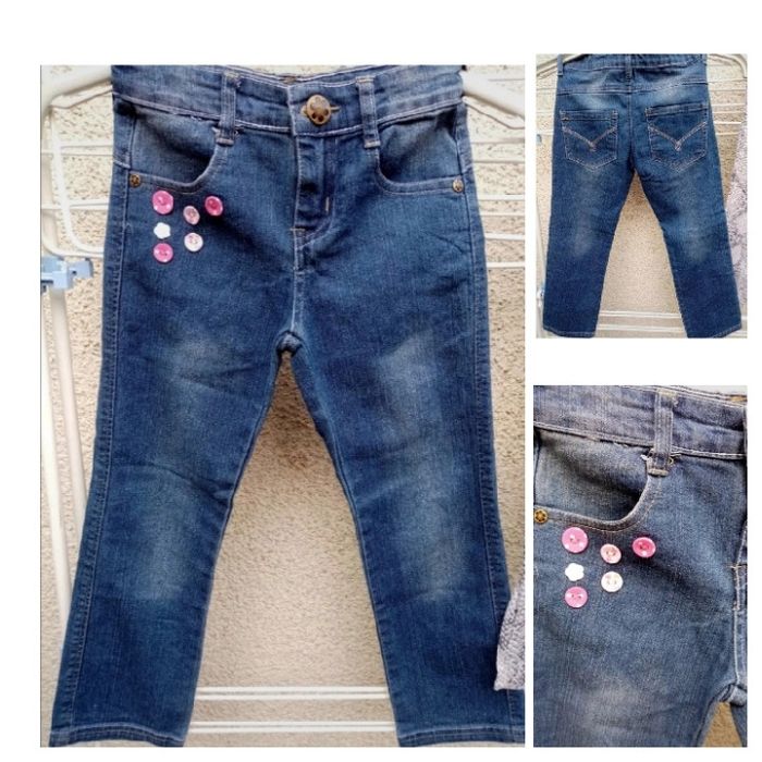 ✨Un jean bleu avec des boutons décoratifs sur le devant, taille ajustable.