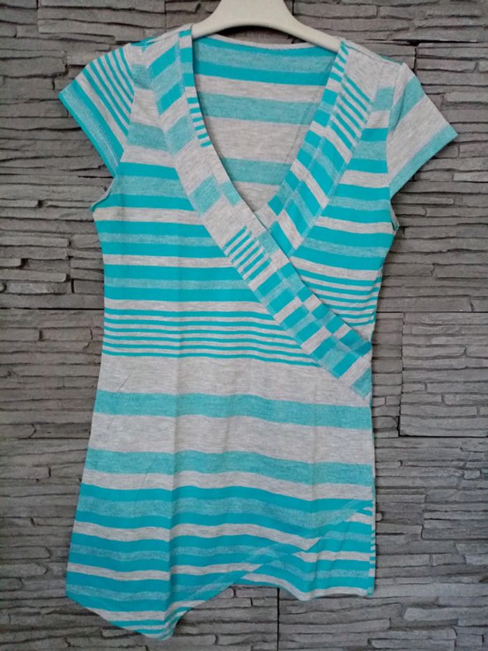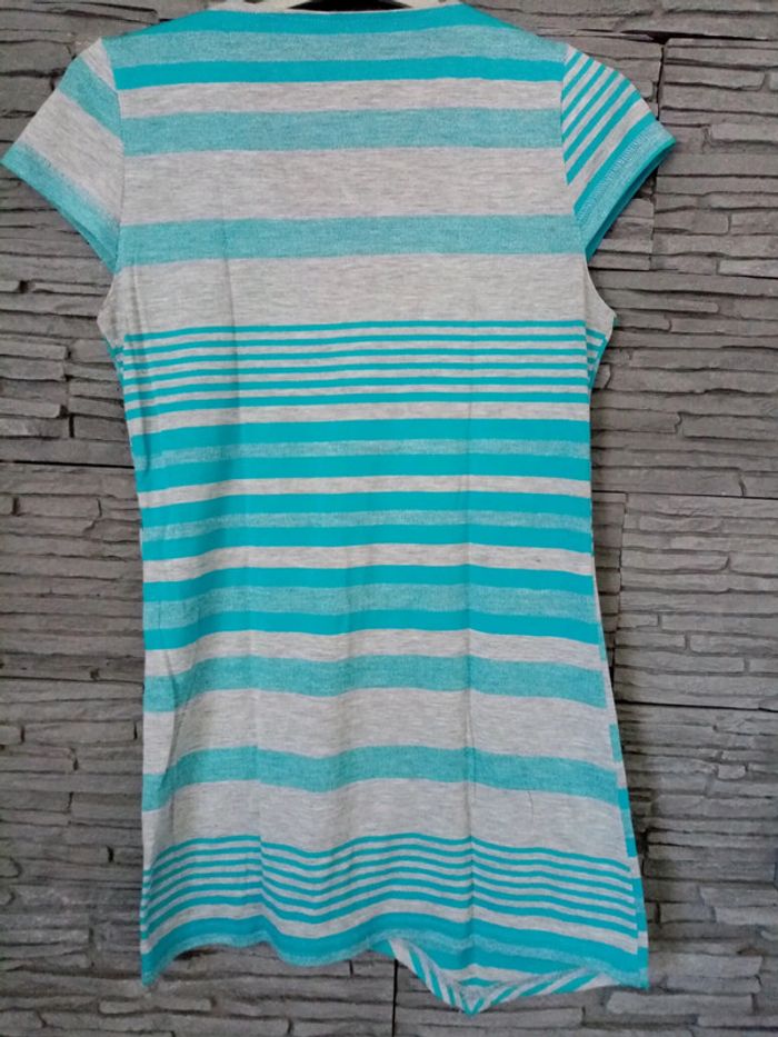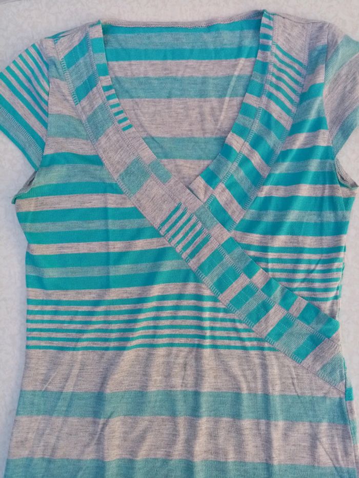 Haut rayé avec de petites manches et le bas asymétrique. Pas de taille noté je dirais 36/38 📦2 Si vous avez des questions n'hésitez pas