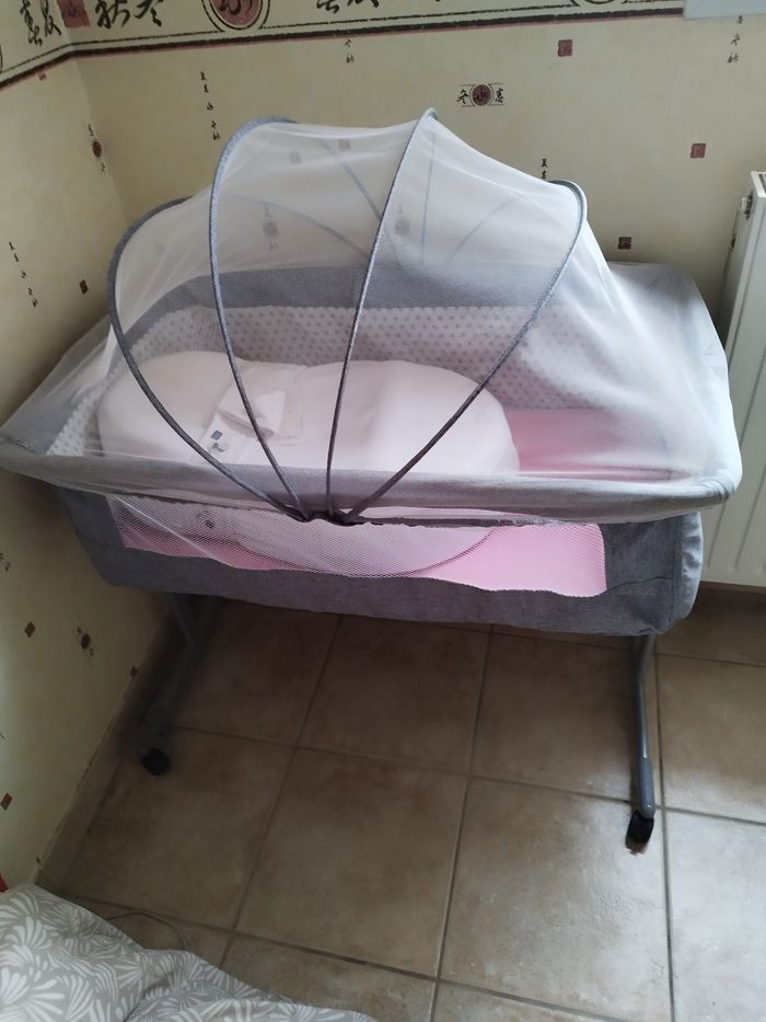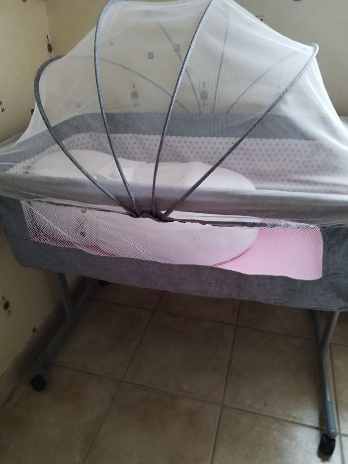 Lit cododo bébé avec moustiquaire pour l'été 😊. Utilisé trois mois vendu sans le matelas cocoonababy ( il est vendu à part ) . Il y a un matelas au fond du lit déjà fourni et deux paires de draps.