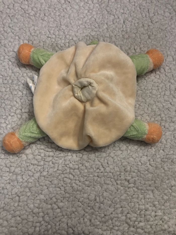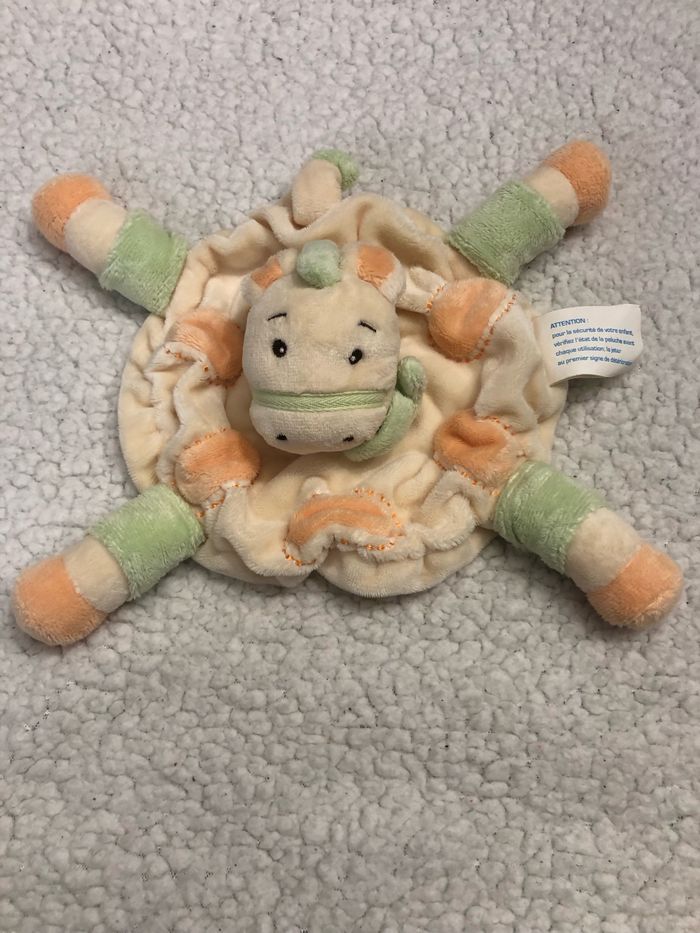 Doudou cheval, poney, âne Plat rond ecrue orange vert Kimbaloo Occasion en très bon état Vous achetez le doudou que vous voyez que la proto
