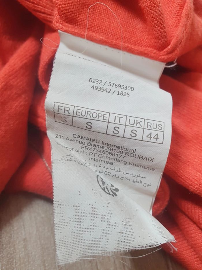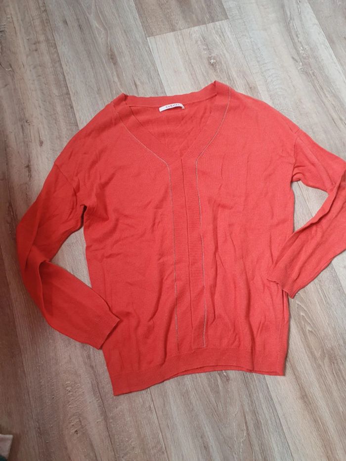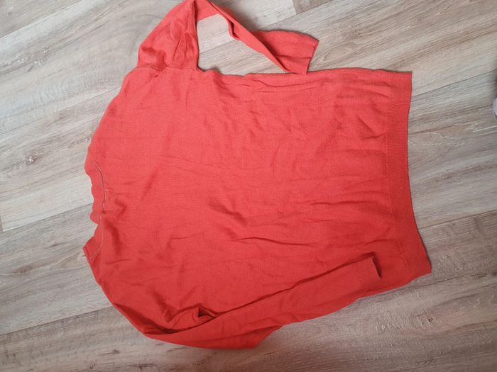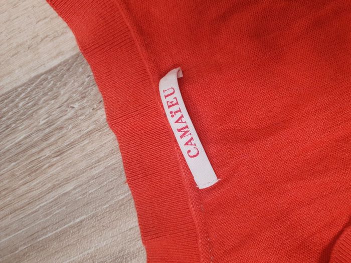 Petit pull fin Camaieu en taille S, en bon état voir très bon état. Sauf étiquette interieur un peu abîmée (voir photo). #pullfin #pull #camaieu #corail #Orange #petitpull