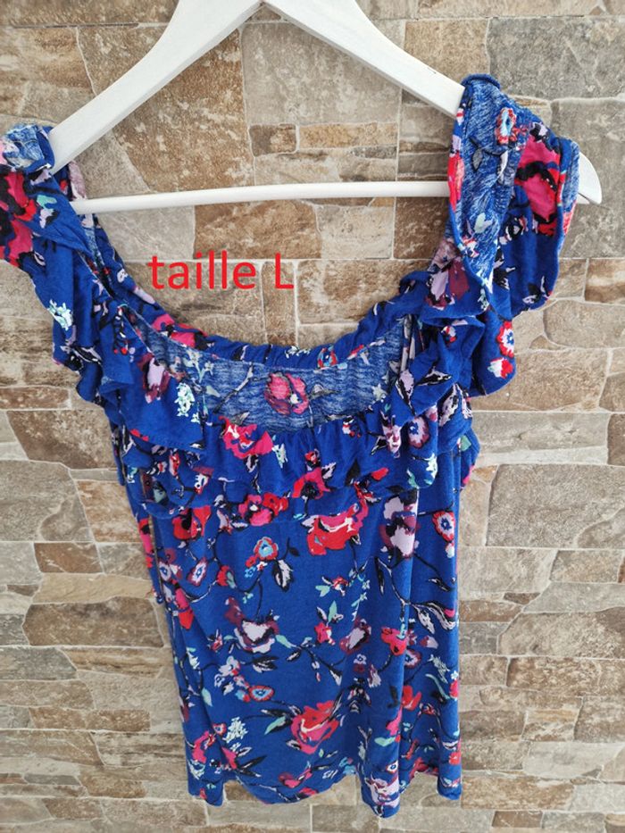1 t-shirt bleu motifs fleurs à bretelle taille L marque Yessica
