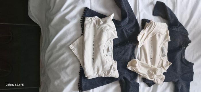 Sweat 2 en 1 gris avec Tee-shirt écru bébé ouverture croisée dos fermeture par pression excellent état il y a 2 ensembles.