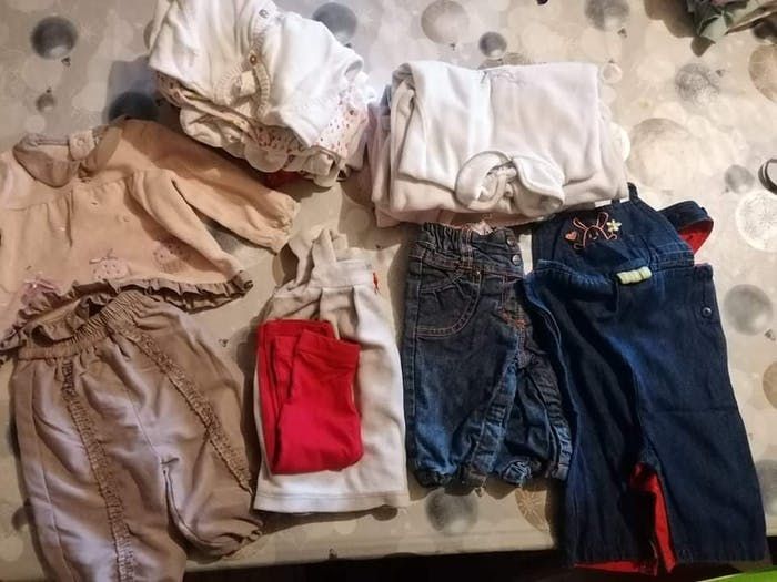 Lot comprenant : - 3 pyjamas - 1 gilet blanc - 3 bodies ( 2 manches courtes + 1 manches longues) - 4 hauts manches longues (dont 3 cols roulés) - 1 ensemble (haut manches longues +pantalon) rose et taupe - 1 robe épaisse - 1 legging - 1 salopette - 1 jeans Le lot est en très bon état
