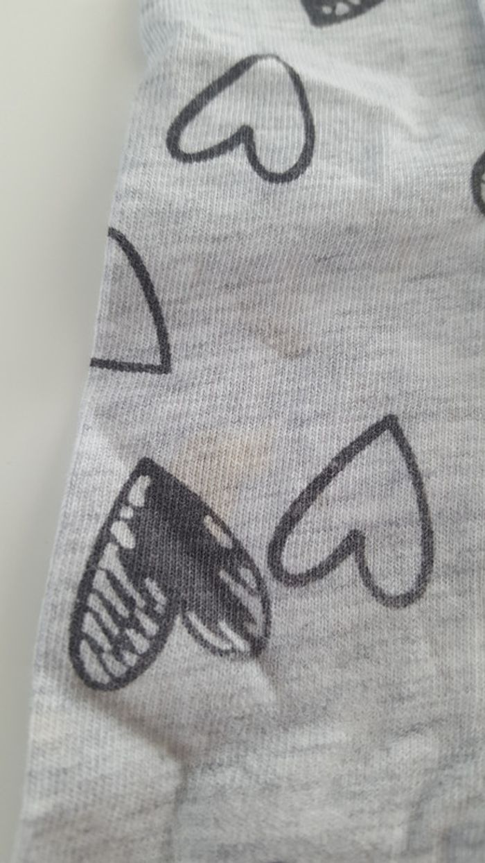 legging gris clair motifs cœurs noirs petite tâche qui ne part plus au lavage, au niveau du genou droit (voir photo N°2) mais n'empêche pas de porter le vêtement