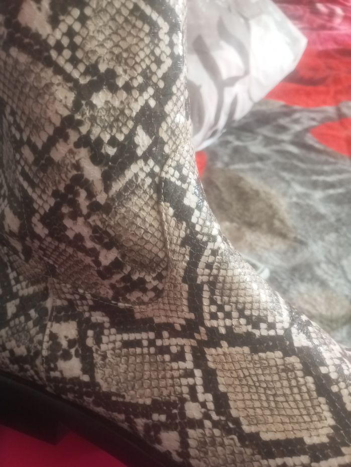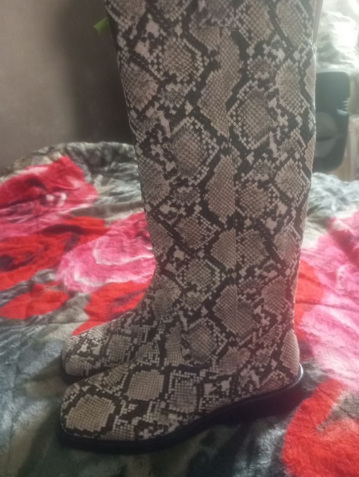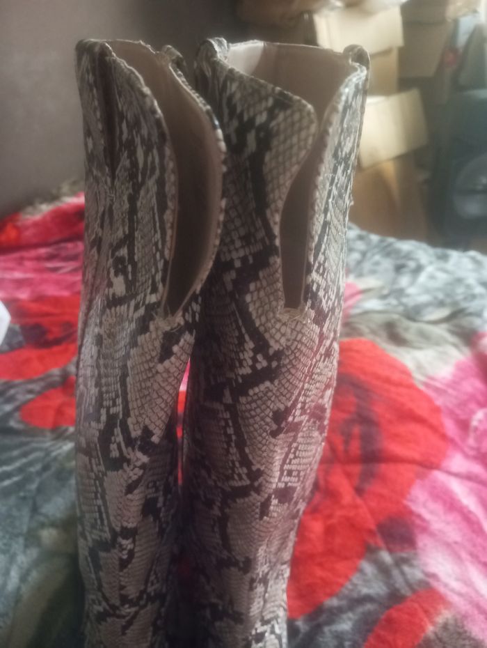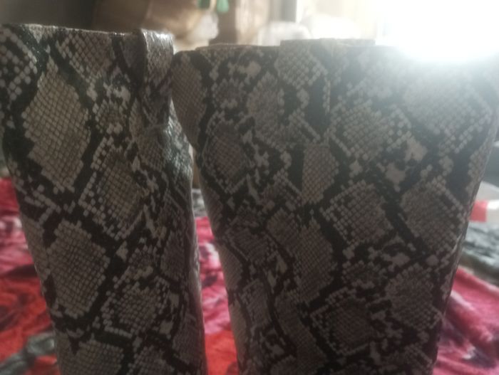 Botte pointure 39 jusqu au genou sans fermeture petit talon de 2,5 cm a peu près couleur serpent