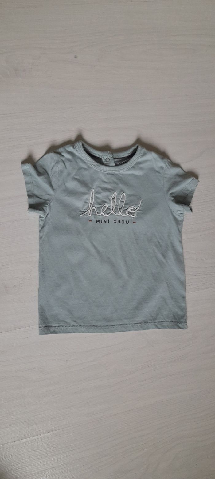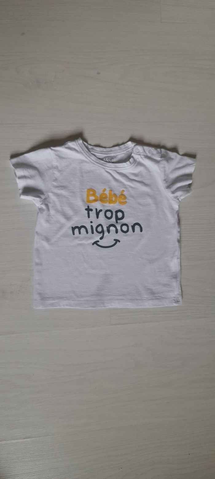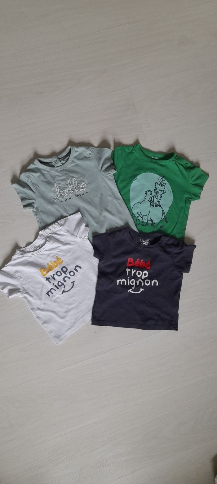 4 Tee-shirt T 24 mois 1 bleu marine et 1 blanc avec motif devant et attache pressions sur épaule gauche ( BASIC ONE) 1 vert avec motif de et attache boutons sur épaule gauche ( KIABI) 1 vert clair avec motif devant et attache boutons sur cou arrière ( KIABI) Très très bon état