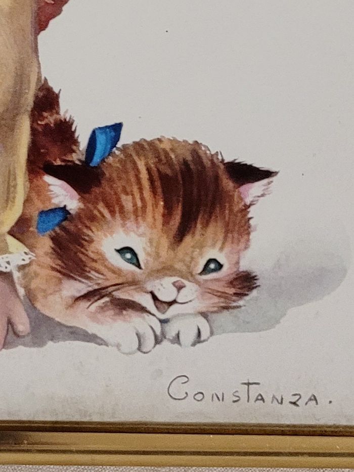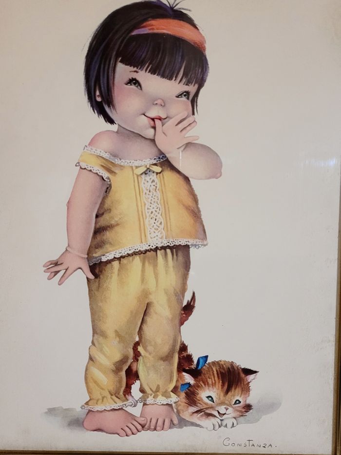 années 60 / 70 encadrement en métal doré avec verre dessin d'une petite fille avec un chaton dimensions 25,5 x 22 cm dans l'état des photos, qui font partie du descriptif