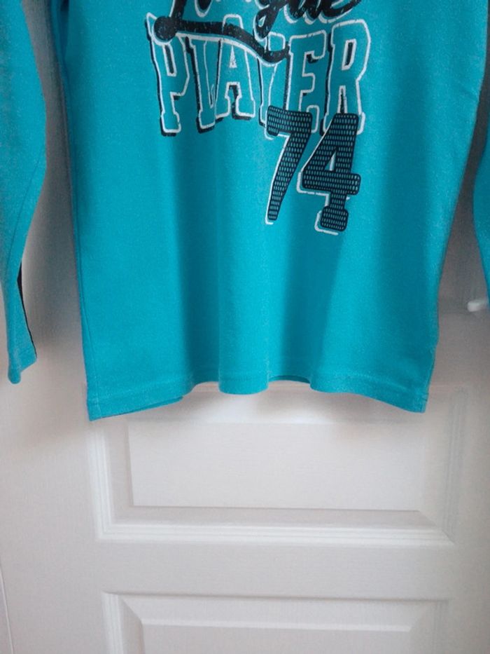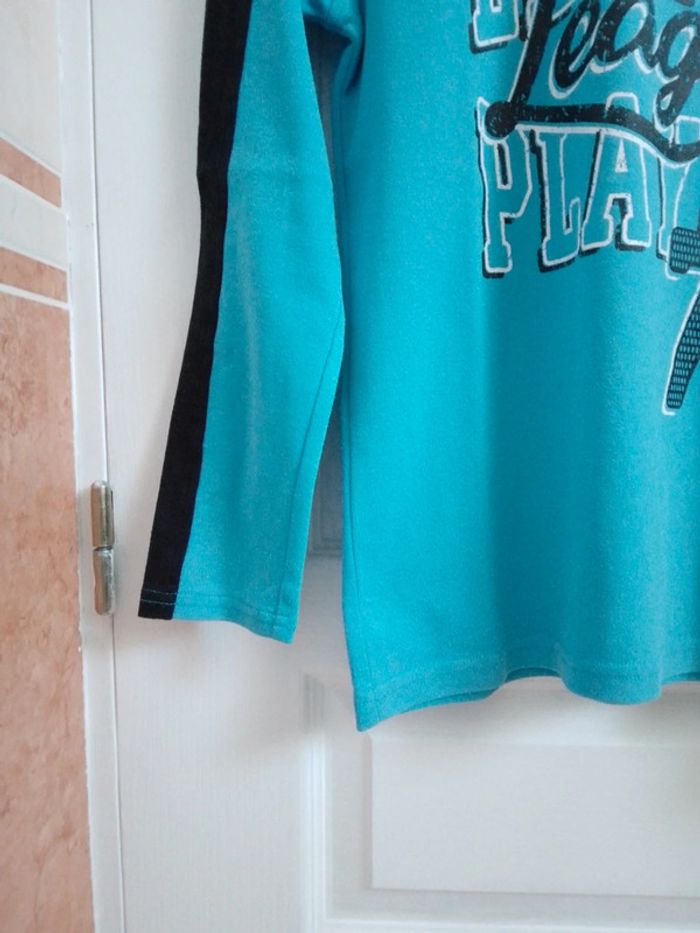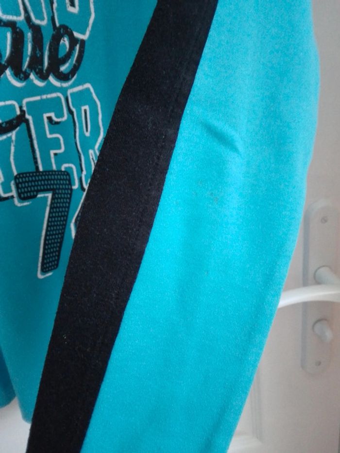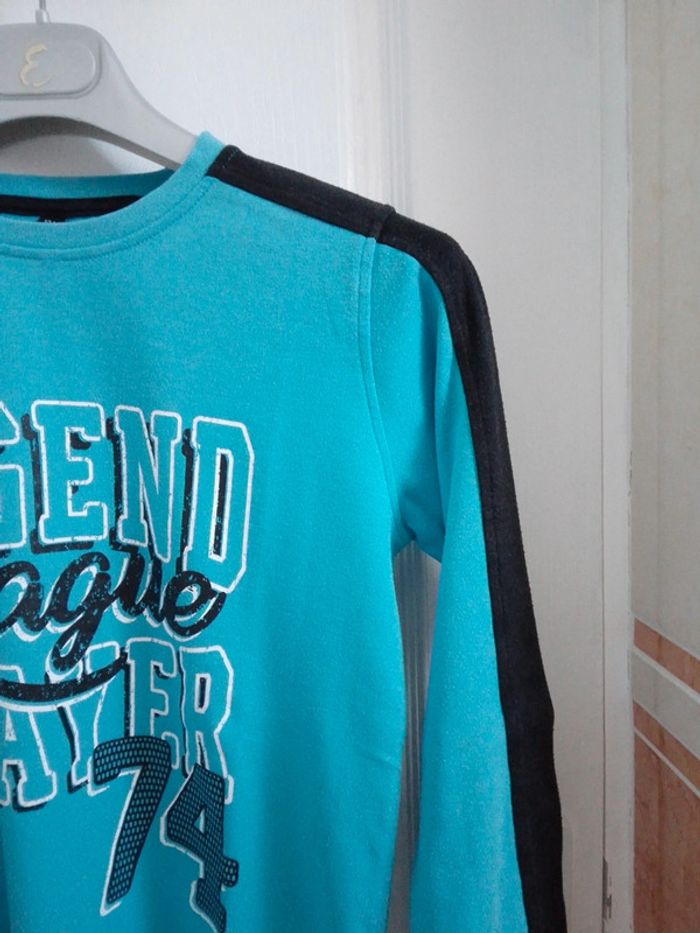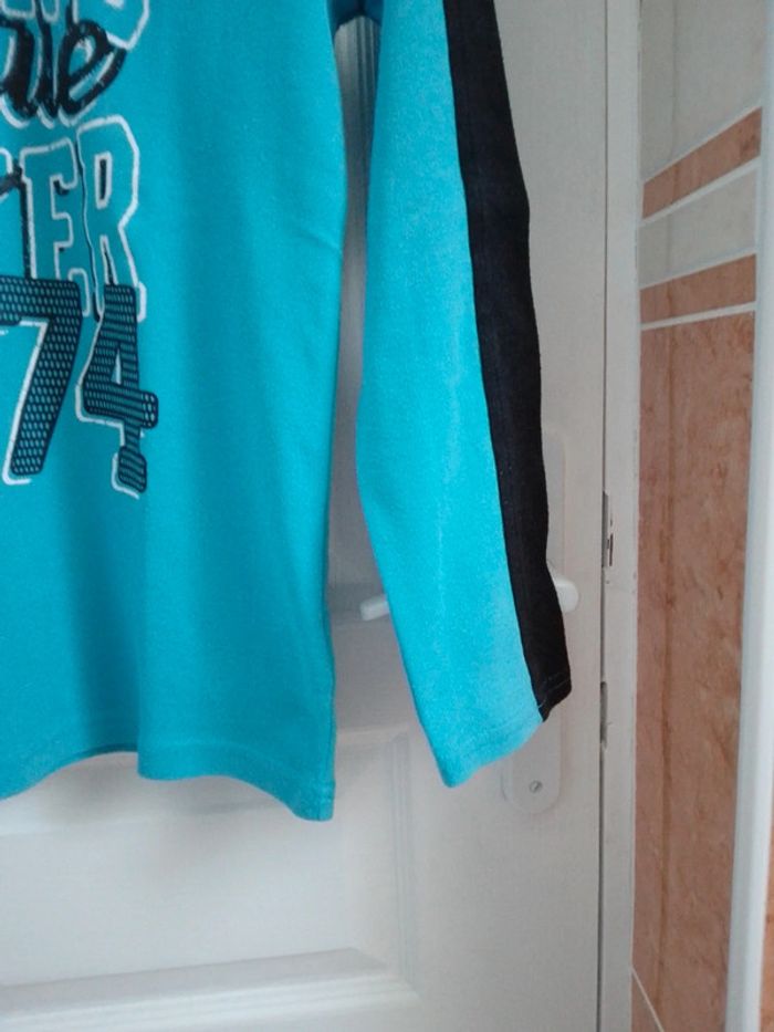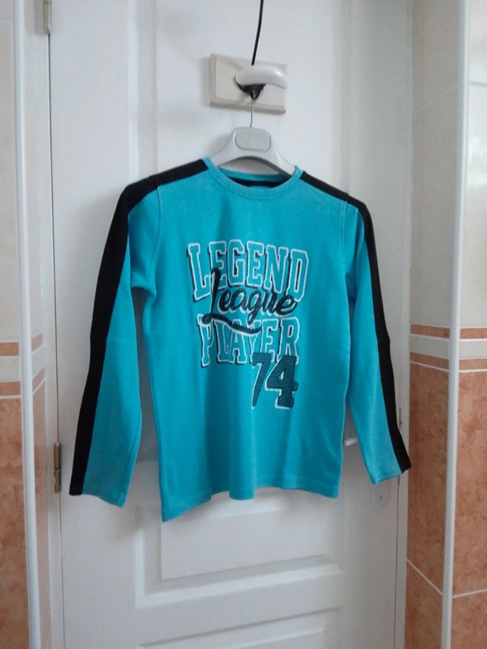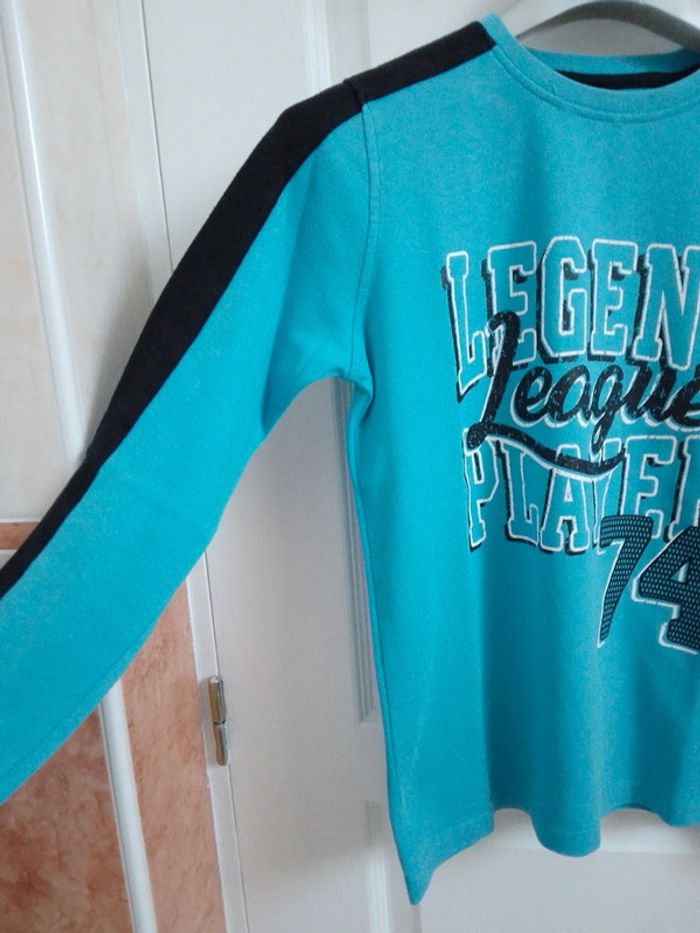 En bon état, porté plusieurs fois. - T-shirt manches longues bleues et bandes noires sur les manches avec motif central "Legend Player 74" devant, dos uni. (⚠️ A signaler : petites tâches derrière le coude gauche, voir dernière photo). - 60% coton, 40% polyester. - Taille 12 ans. *Rappel : -5% pour 3 articles, -10% pour 5 articles. #sambaetmayline21Garçon12ans