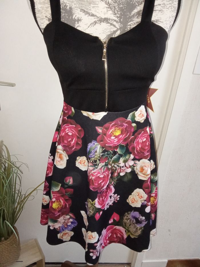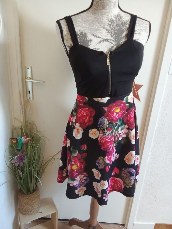 Robe bustier, motif fleuri, fermeture éclair sur le devant qui permet d'adapter le décolleté. Arrive mi cuisses environ, légère et fluide. Beaucoup d'autres robes et vts femme également à vendre ds mon dressing et réduction activée