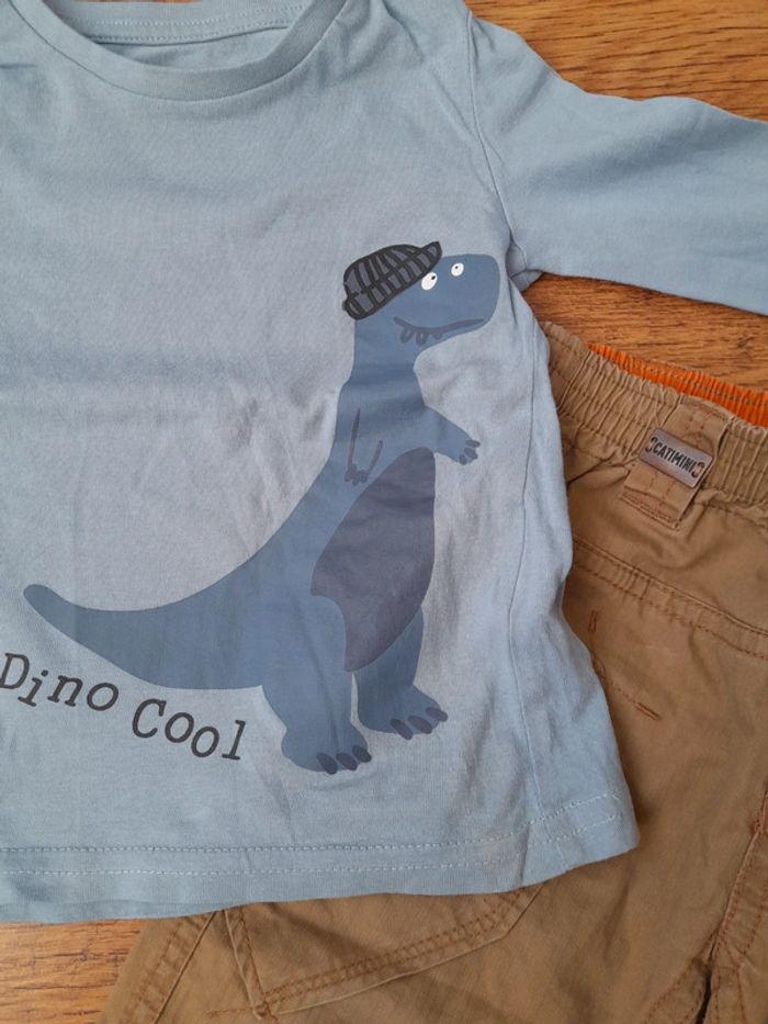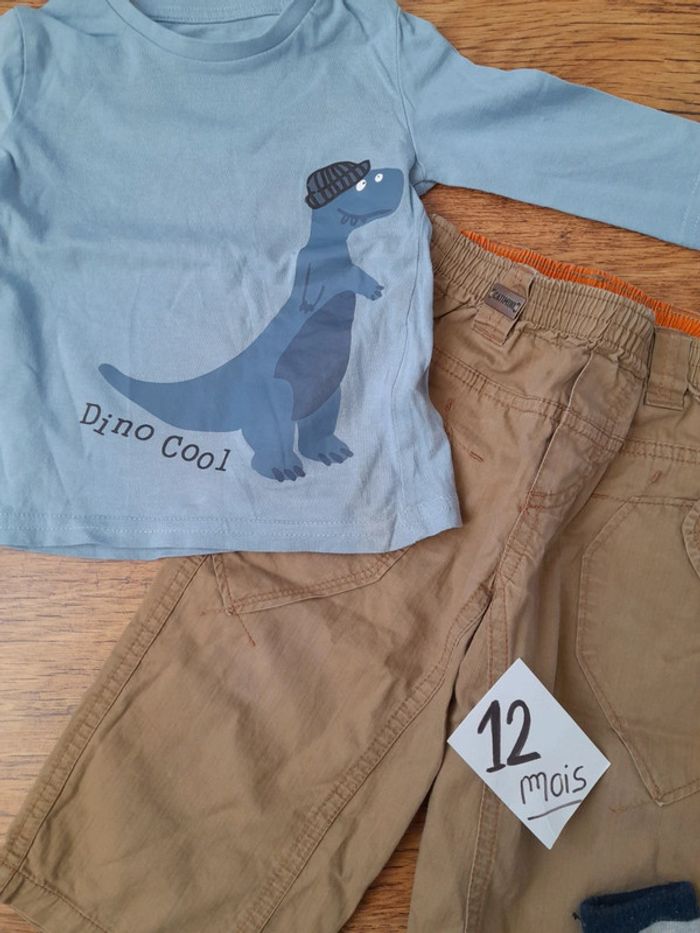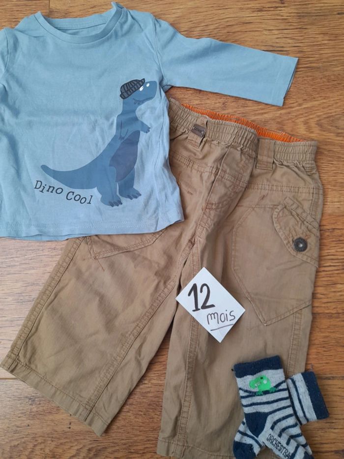 Ensemble 3 pièces composé d'un pantalon Catimini en excellent état, d'un tee-shirt dinosaure de chez Gemo Neuf jamais porté et d'une paire de chaussettes dinosaure orchestra . En 12 mois Réduction intéressante en lot #12moisbabyestlé