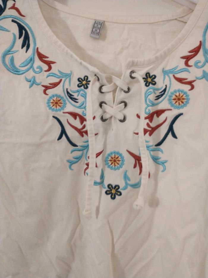 T-shirt taille 46 48 coloris écru motif fleuri fermeture avant par lacet