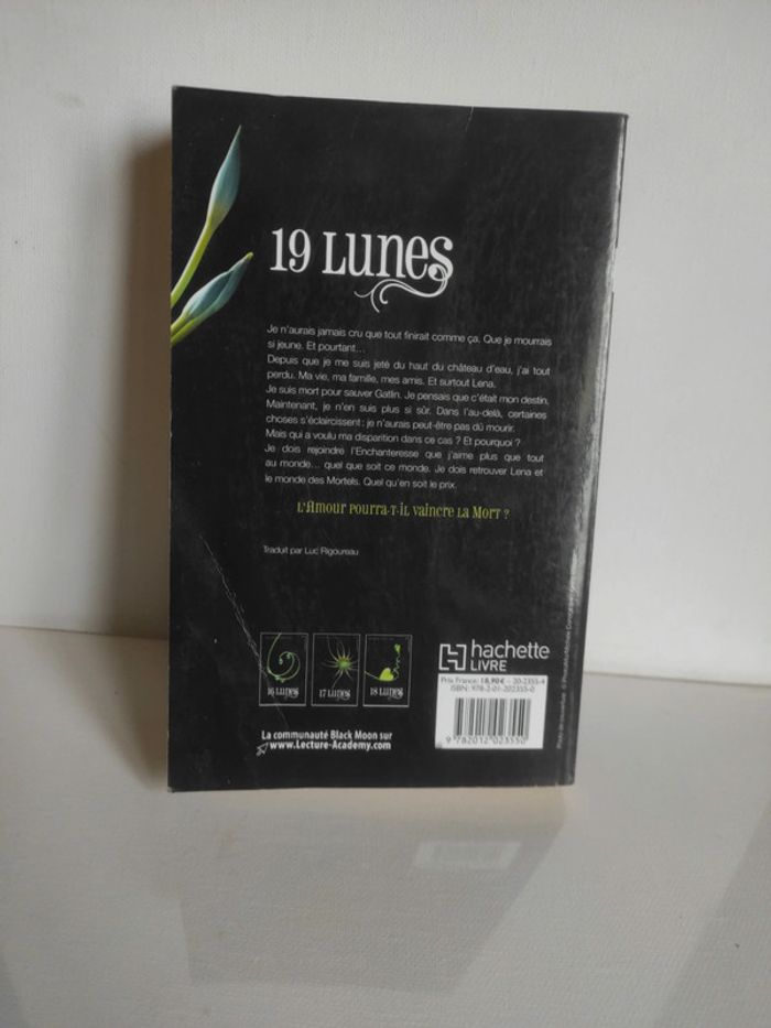 les pages ne sont plus blanche sur les tranches très légèr cornement des angles Livre ayant été lu Tome 4 de la célèbre saga 16 lunes dont le titre est 19 lunes Compléments de description :  Livre de style Bit Lit soit des livres pour jeune adulte. Un univers fantastique captivant et très prenant En fonction des livres vous aurez des univers magique  de type fées , vampires, loups garou etc Les livres sont exactement dans l’état que vous voyez sur les photos. Celles-ci font entièrement partie de la description de l’objet. Un description détaillée vous aura été mise dans la partie haute de l’annonce.  Pour plus d'informations vous pouvez me contacter directement je vous répondrais avec plaisir  Transport :  Les frais de port sont calculés au plus juste pour un envoi via MONDIAL RELAY . Je ne fais pas les envois colissimo tout achat par ce mode ne sera pas accepté. Les colis sont préparés avec le plus grand soin. Chaque article est emballé individuellement pour éviter les frottements et bien sûr le tout est bien calé afin d’éviter les casses durant les transports.  Je n’utilise que des cartons pour les envoi pas de sac poubelles ou autre chose. Achat multiple:  Plusieurs articles peuvent être mis dans un même colis. Comme il y a un souci pour créer des lots via l’interface de Vinted n’hésitez pas à me contacter directement pour que je vous les fasses. Au vu du nombre important de favoris merci de m’indiquer par message les articles en question. Une nouvelle annonce sera créée avec les screens écran des articles et des description.  Référencement :  #livre #bit-lit #bitlit #fantastique #fantasy #romance #adulte #adolescent #jeuneadulte #passetemps #passe-temps #loisir #culture #univers #passion #prenant #vampire #fée #loup-garou #loupgarou #enquête  #collection #collectionneur #geektradebitlit #geektradelivre