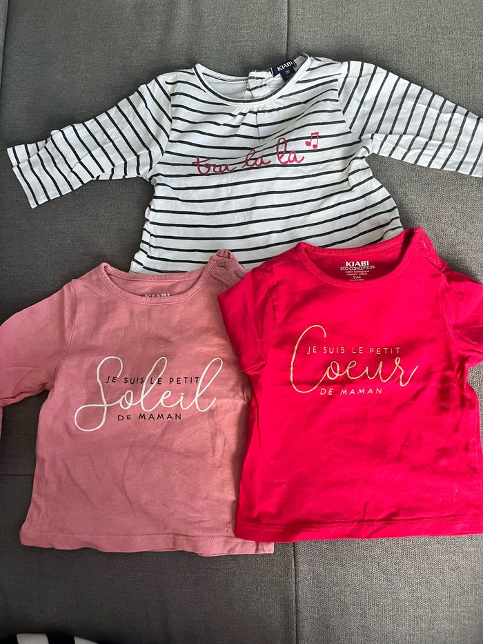 3 t-shirt manches longues 3 mois Marque kiabi Très bon état Lot pouvant être modifié avec d’autre vêtements du dressing N’hésitez pas à demander