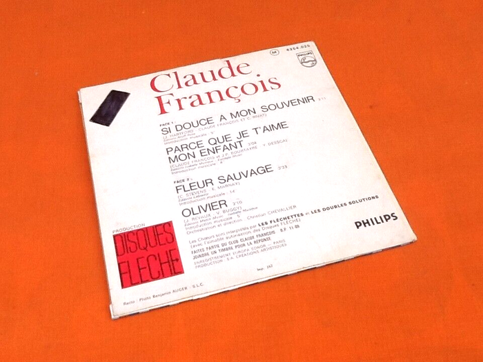 (article vendu en l' état, état d' usage, micro rayures qui n' empêchent pas l' écoute du vinyle, voir toutes les photos) Vinyle 45 tours Claude François Si douce à mon souvenir (1970) Philips 6254.025 A1 Si Douce A Mon Souvenir 3:11 A2 Parce Que Je T'aime Mon Enfant 3:04 B1 Fleur Sauvage 3:33 B2 Olivier 3:10