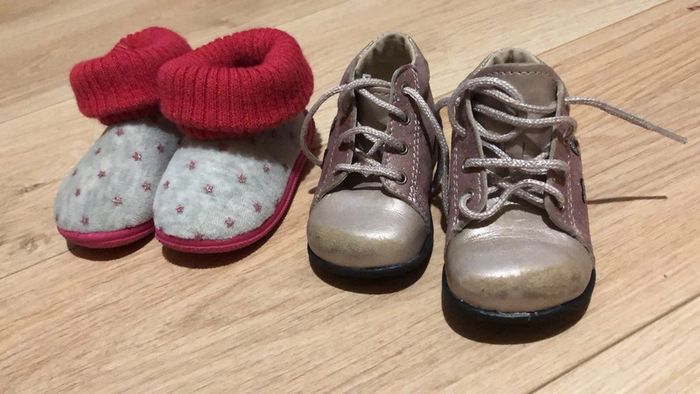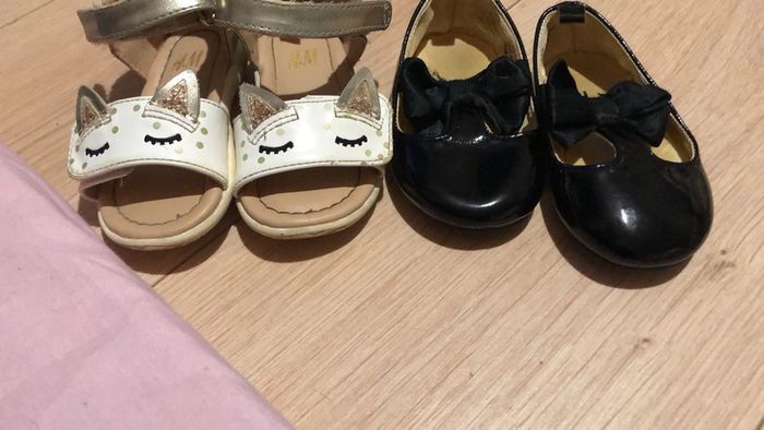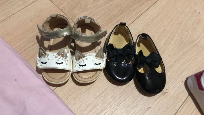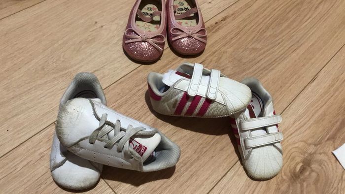 chausson gemo et chaussure pat et ripaton rose taille 18 sandale chat et ballerines HetM 18/19 ballerine neuve à paillettes rose pat et ripaton stan smith usées mais peuvent encore servir et superstar bon état taille 19
