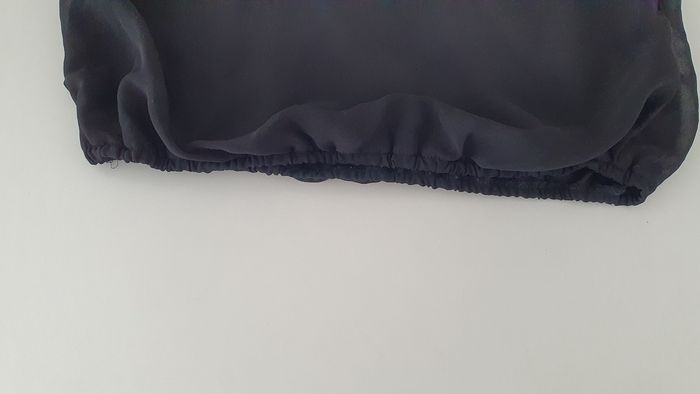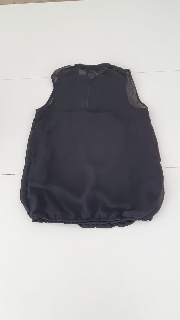 Blouse noir en très bon état Transparente au niveau du decolleté et du dos Elle se ferme par 2 boutons au niveau du cou Le bas de la blouse est élastique