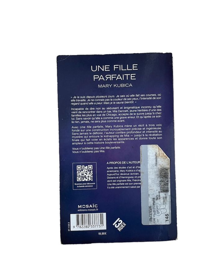 Bonjour,je vous présente ce livre 📕 - Une fille parfaite - Mary Kubica - Mosaic - Bon état - Résumé : « Je la suis depuis plusieurs jours. Je sais où elle fait ses courses, où elle travaille. Je ne connais pas la couleur de ses yeux, l’intensité de son regard quand elle a peur. Mais je le saurai bientôt. » Incapable de dire non au séduisant et énigmatique inconnu qu’elle vient de rencontrer dans un bar, Mia Dennett, jeune héritière d’une des familles les plus en vue de Chicago, accepte de le suivre jusqu’à chez lui. Sans savoir qu’elle a commis une grave erreur. Et qu’après ce soir-là rien, jamais, ne sera plus comme avant. Avec Une fille parfaite, Mary Kubica mène un récit à trois voix fondé sur une construction incroyablement précise et ingénieuse. Sans jamais le déflorer, l’auteur confère profondeur et intensité au mystère qui entoure le kidnapping de Mia — jusqu’à la révélation finale qui fait voler en éclats les apparences et donne toute son ampleur à cette histoire bouleversante. 📕 MP pour plus d’informations ou de photos. Réduction sur les lots activée. Prix négociable Autres livres dans mon dressing : #estelledupont96Thriller