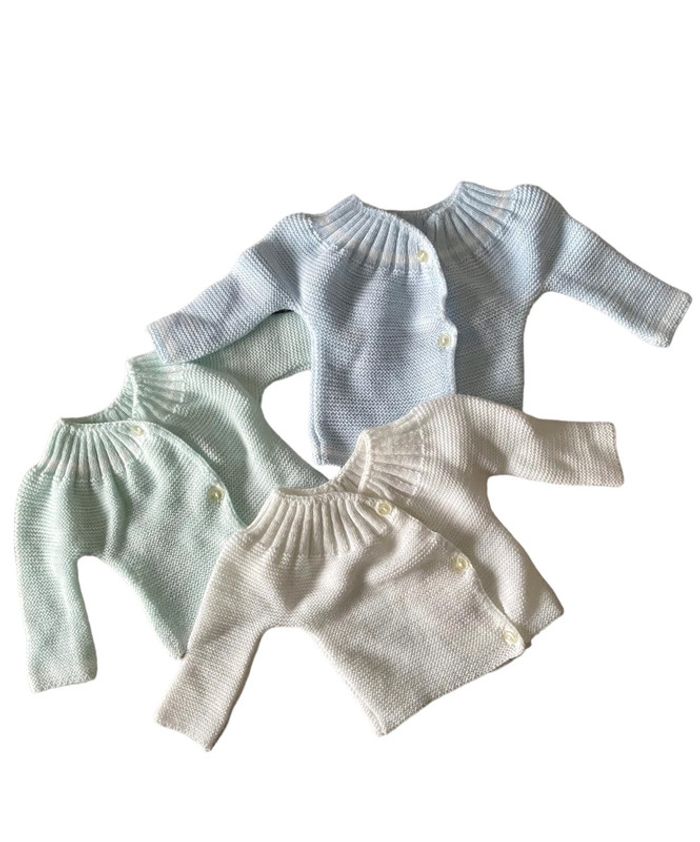 Lot de trois gilets naissance blanc, vert clair et bleu clair très bon état - photo numéro 13