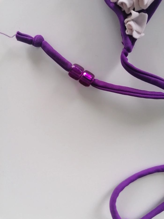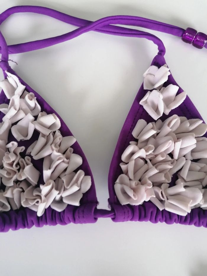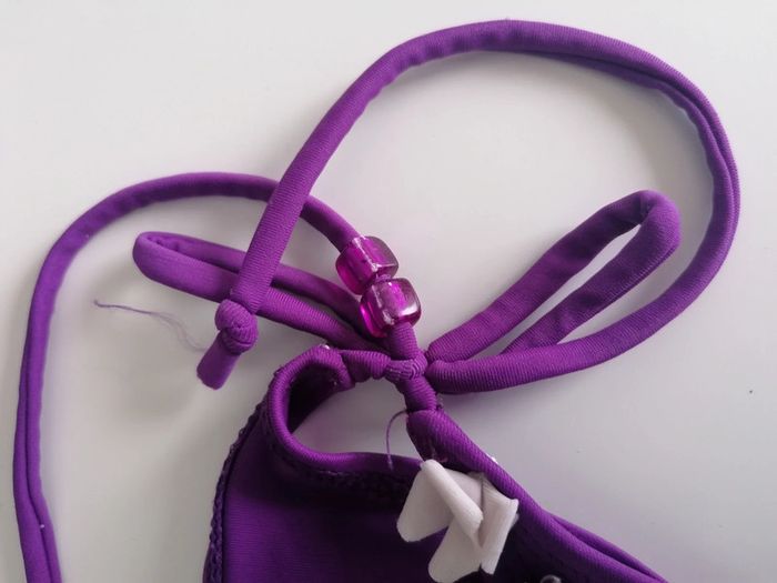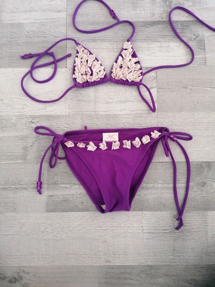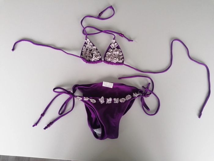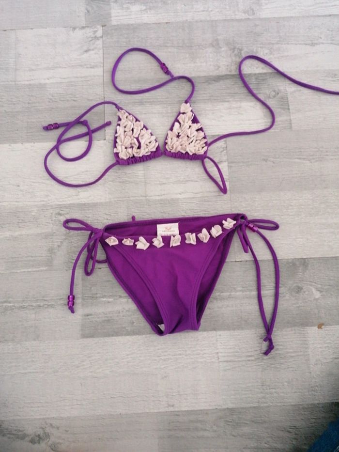Maillot de bain 2 pièces Violet Réglable ficelle Perles Taille 3/4 ans Propre sans trous Blanc un peu terne
