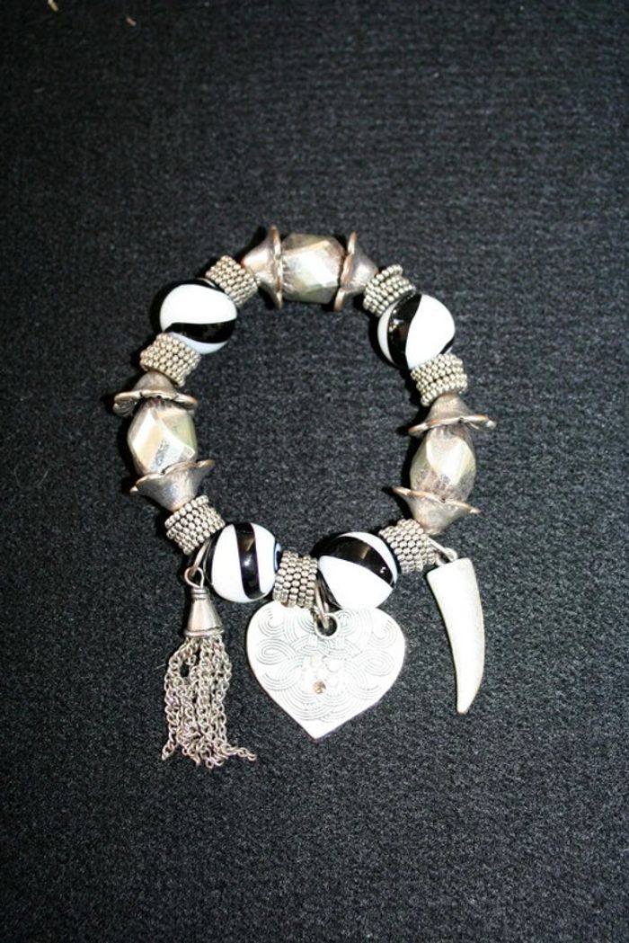 Gros bracelet élastique breloques argent, manque un brillant sur le cœur 90g