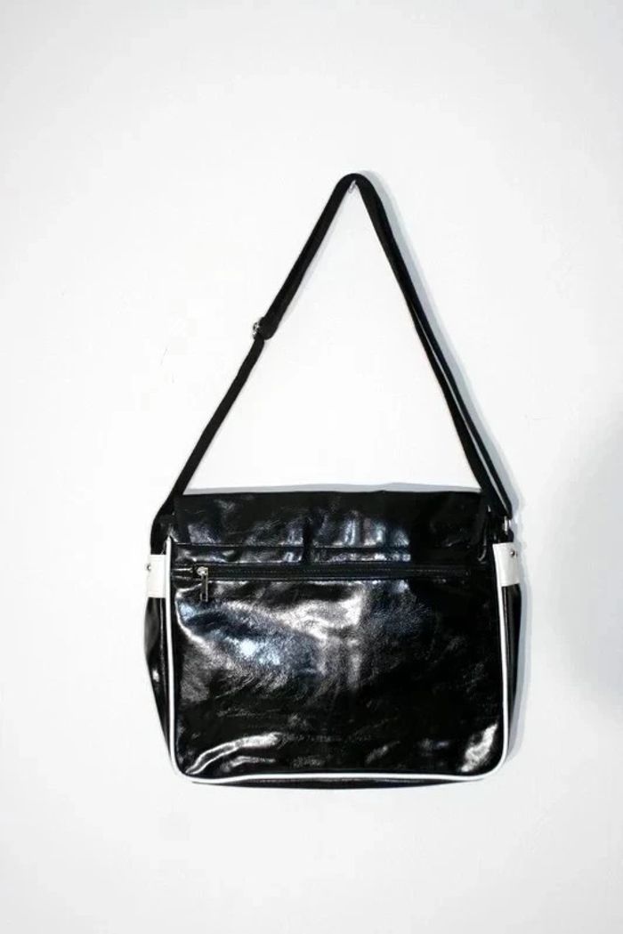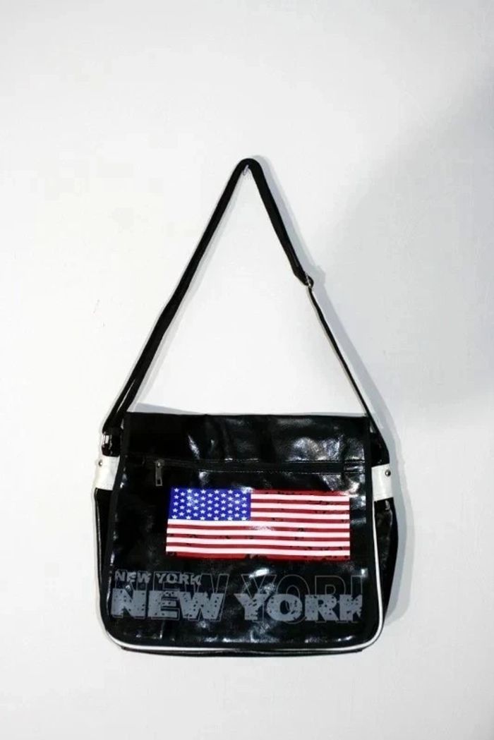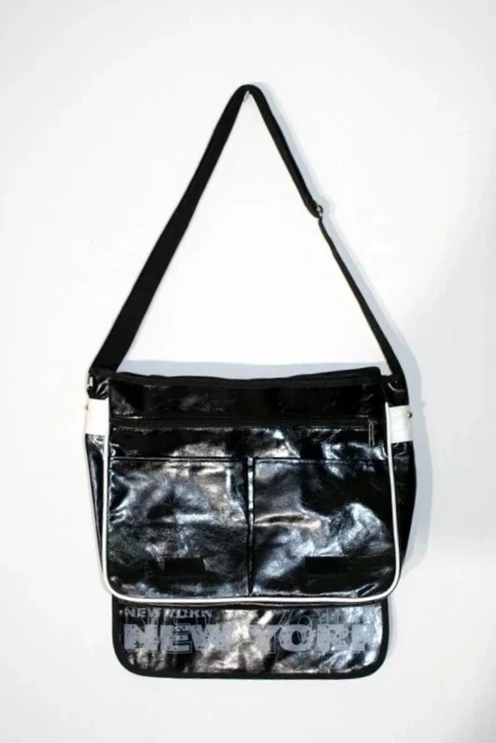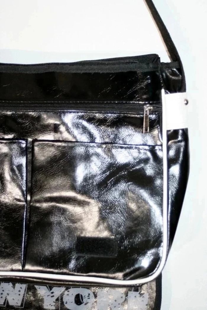 Sac bandoulière vinyle neuf, dimensions 36x33cm, légères traces blanches à l'arrière cf photo, poche zippée à l'avant, poche zippée à l'arrière, fermeture par scratch, 2 poches (légères traces blanches sur une poche) + de nouveau une poche zippée, intérieur fermeture éclair + une poche zippée + 2 poches (genre poche à téléphone portable), 560g