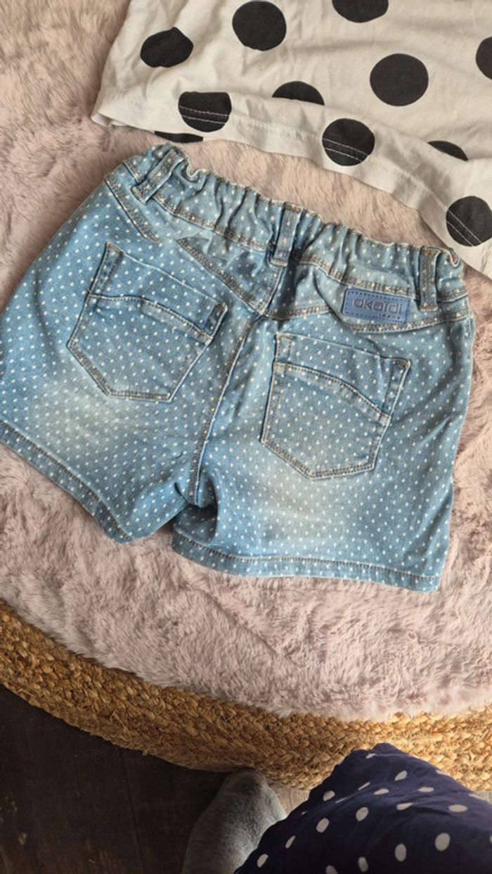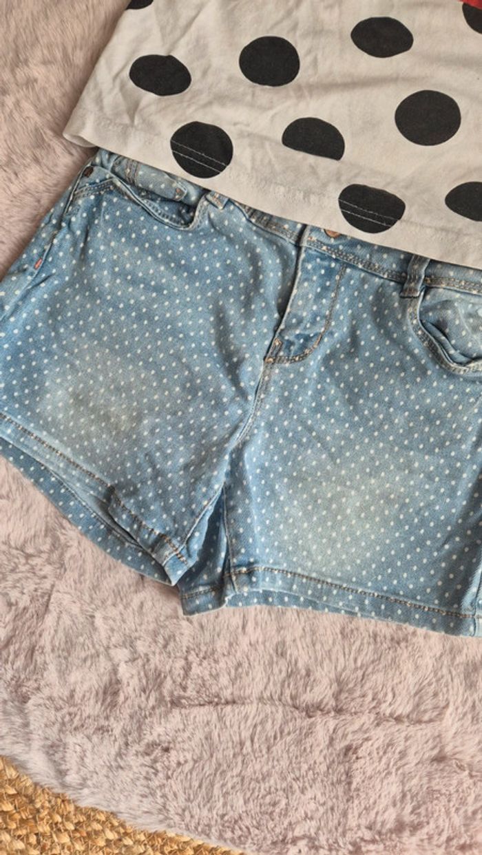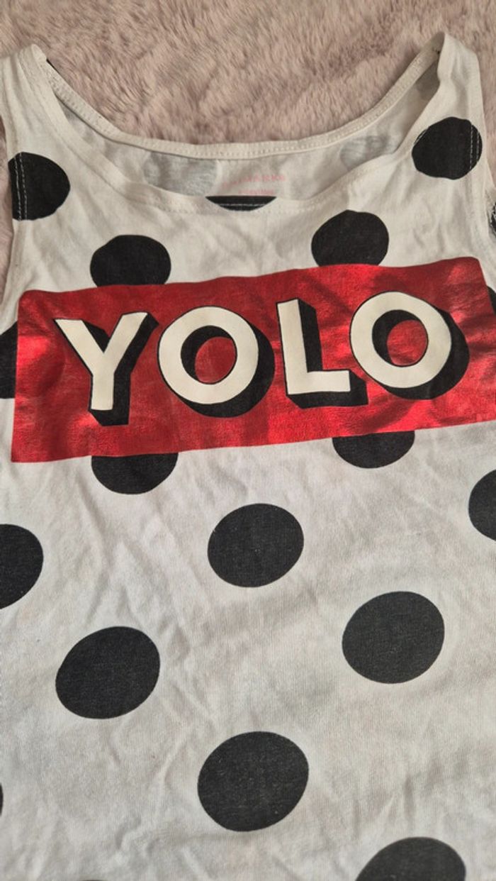 Ensemble comprenant un débardeur crop top à blanc à gros pois noir avec inscription YOLO avec barre rouge métallisé. Enfilage par la tête. Confortable et va avec tout. Taille 9 / 10 ans de chez Primark. Et d'un short en jeans bleu clair à petit pois blanc. Petite fleur brodée sur une des poches. Ajustable à la taille par élastique. De chez Okaïdi en taille 9 ans. #okaidi #primark #fille9ans #dressingdedihya9ans
