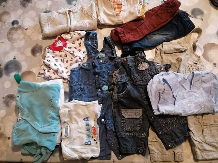 Lot comprenant 14 pièces : - 3 salopettes - 2 bodies - 3 pyjamas ( 2 épais et 1 fin) - 2 T-shirts manches longues - 1 gilet - 2 pantalons - 1 barboteuse Le lot est en très bon état