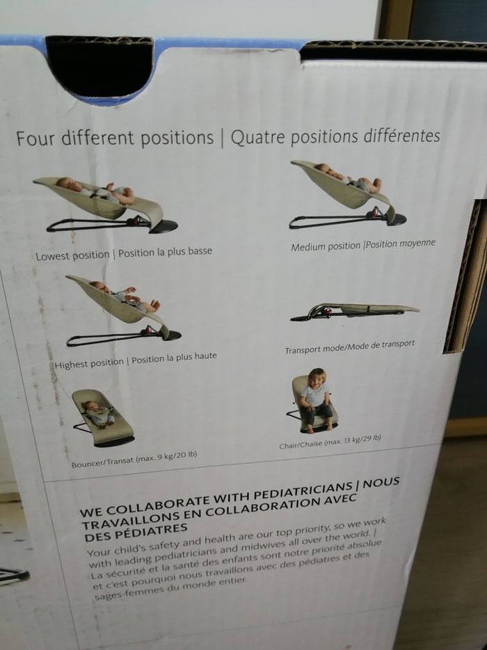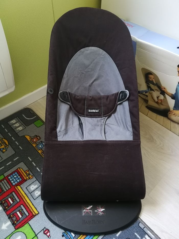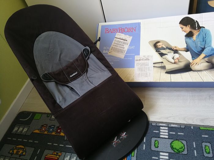 Transat Babybjorn, très peu servi, bon état général, quatres positions différentes, dans sa boîte d'origine, de 0 à 2 ans (3,5 à 13kg).