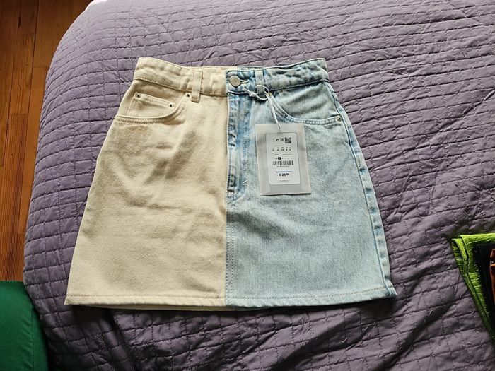 Mini jupe en jean bicolore beige et bleu délavée