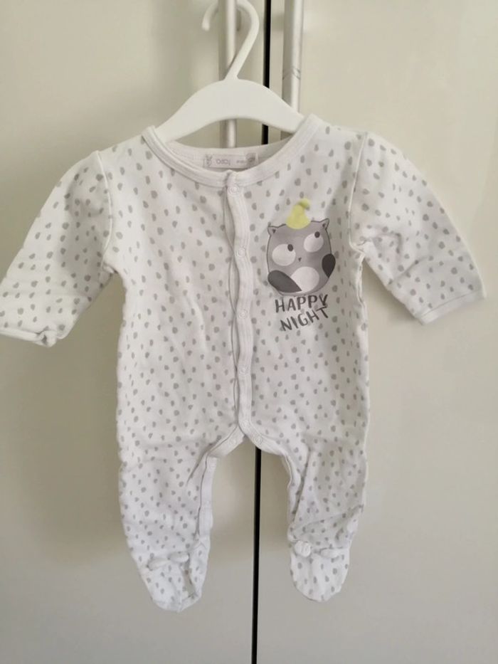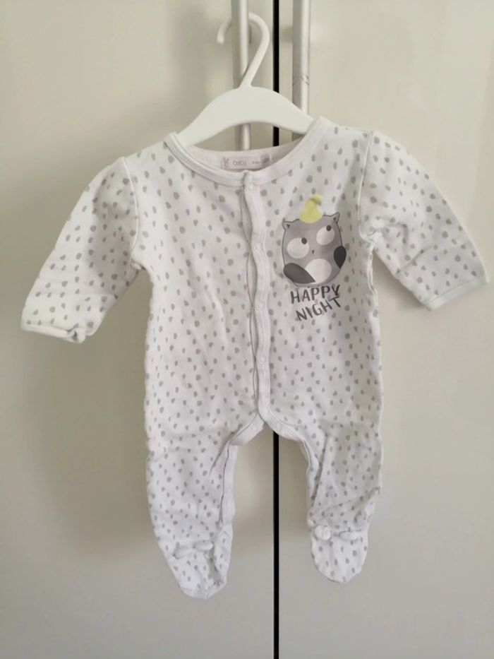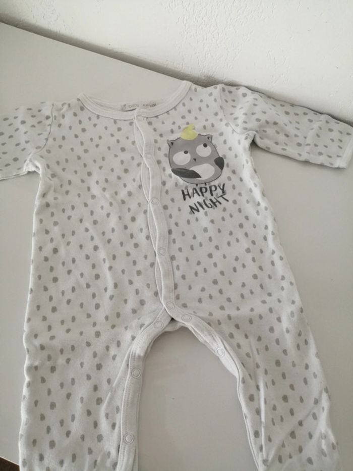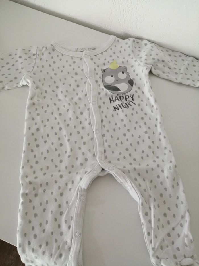 Pyjama léger Coton blanc et gris Motif hibou Gemo Marqué 12 mois mais taille un peu petit (6- 9 mois selon moi) Convient aussi bien à un garçon qu'à une fille Ni trou ni tâche. Le motif est impeccable (aucune craquelure) #lily2905garçon6mois #lily2905garçon9mois #lily2905garçon12mois #lily2905fille6mois #lily2905fille9mois #lily2905fille12mois #lily2905bébémixtedu0au18mois