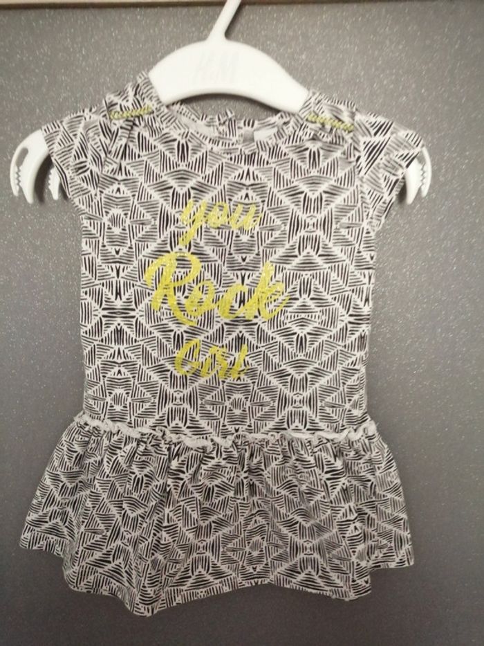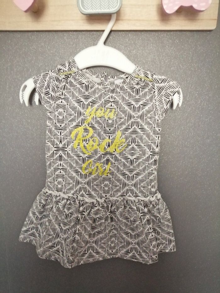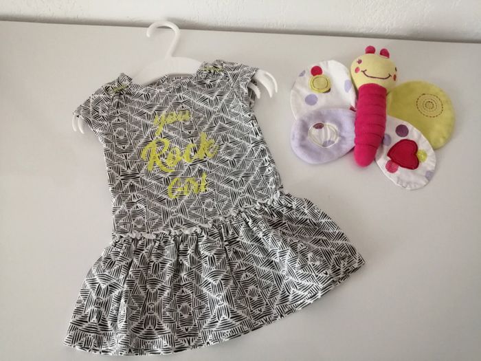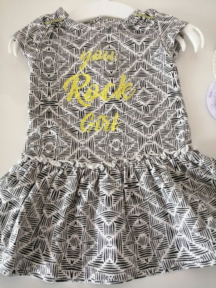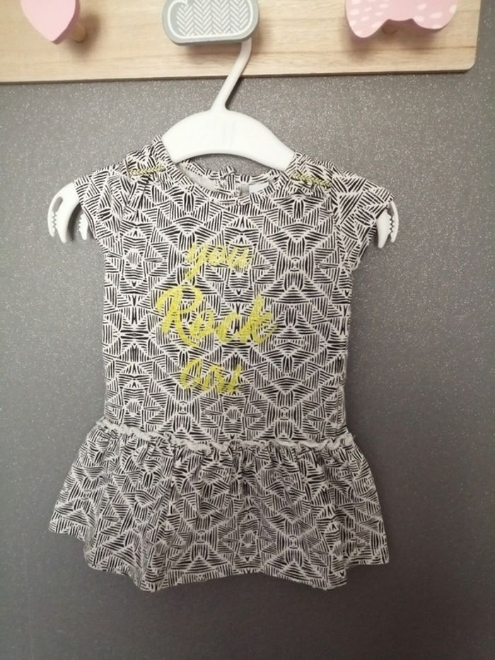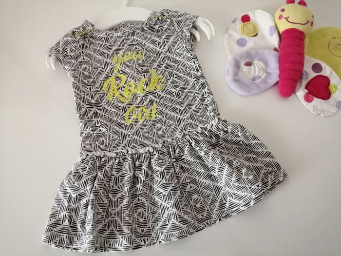 Robe manches courtes Marquée 3/6 mois mais taille comme un 6 mois 3 Pommes Noire et blanche, motif ethnique Inscription "You rock girl" en jaune pailleté Parfait état #lily2905fille6mois