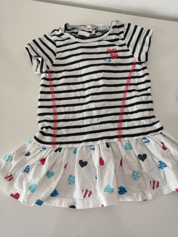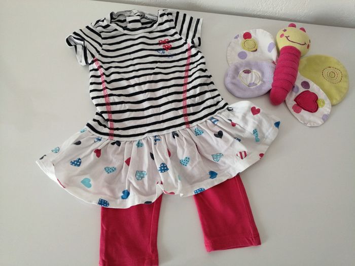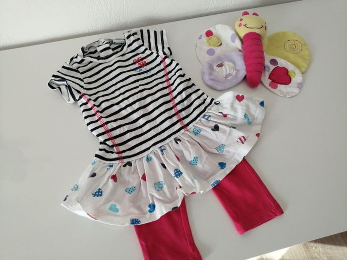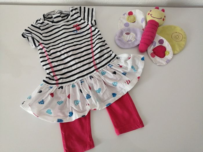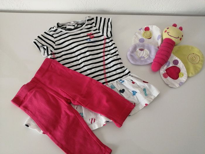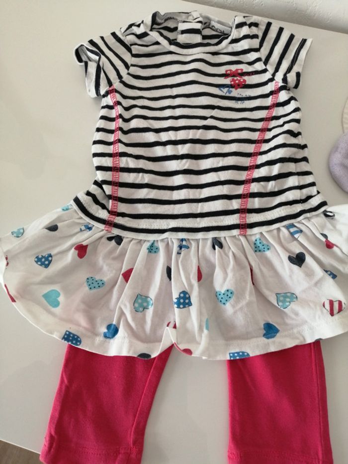 Ensemble 2 pièces 6 mois Très bon état - 1 legging uni rose fushia Manon et Valentin - 1 robe tunique marinière 3 Pommes. Marquée 6/9 mois. Marine blanc et fushia #lily2905fille6mois