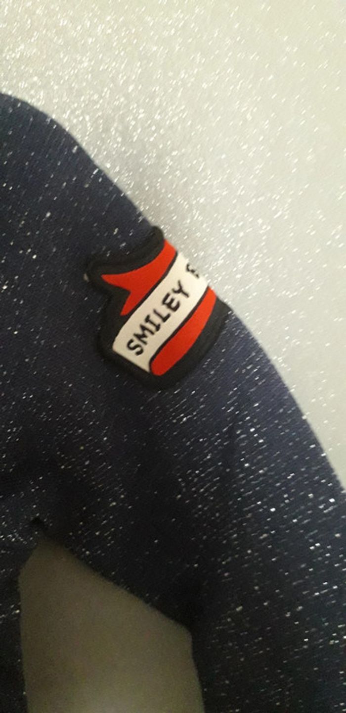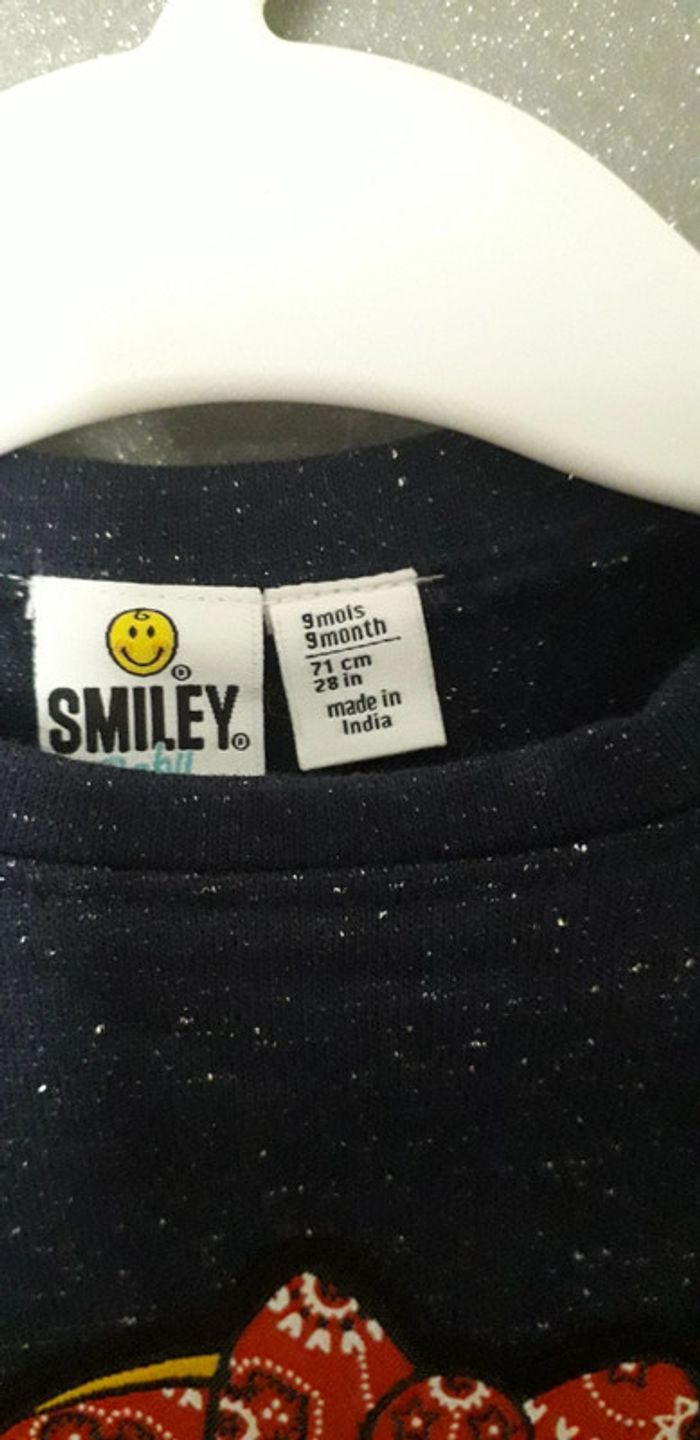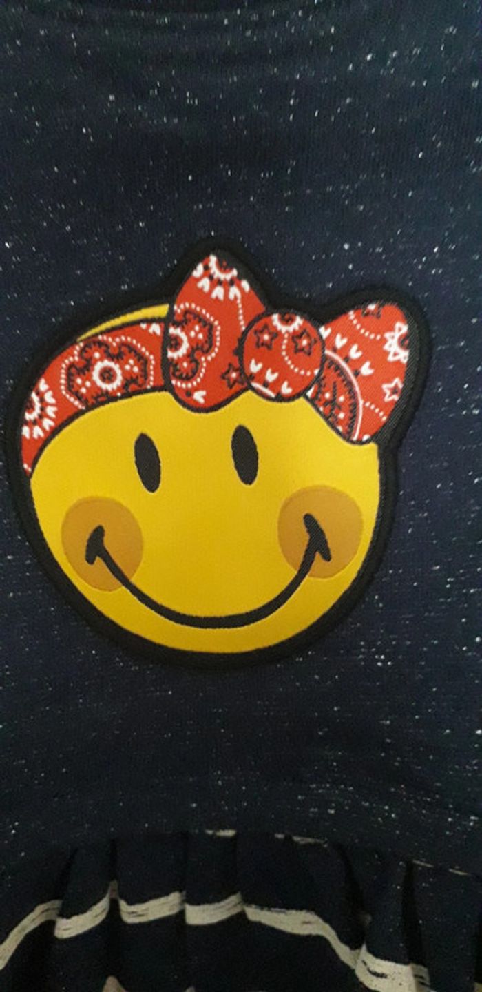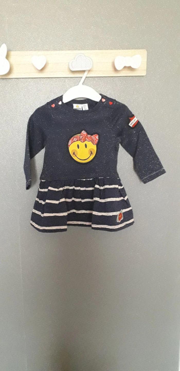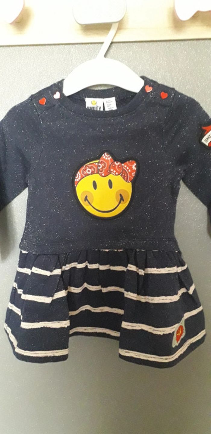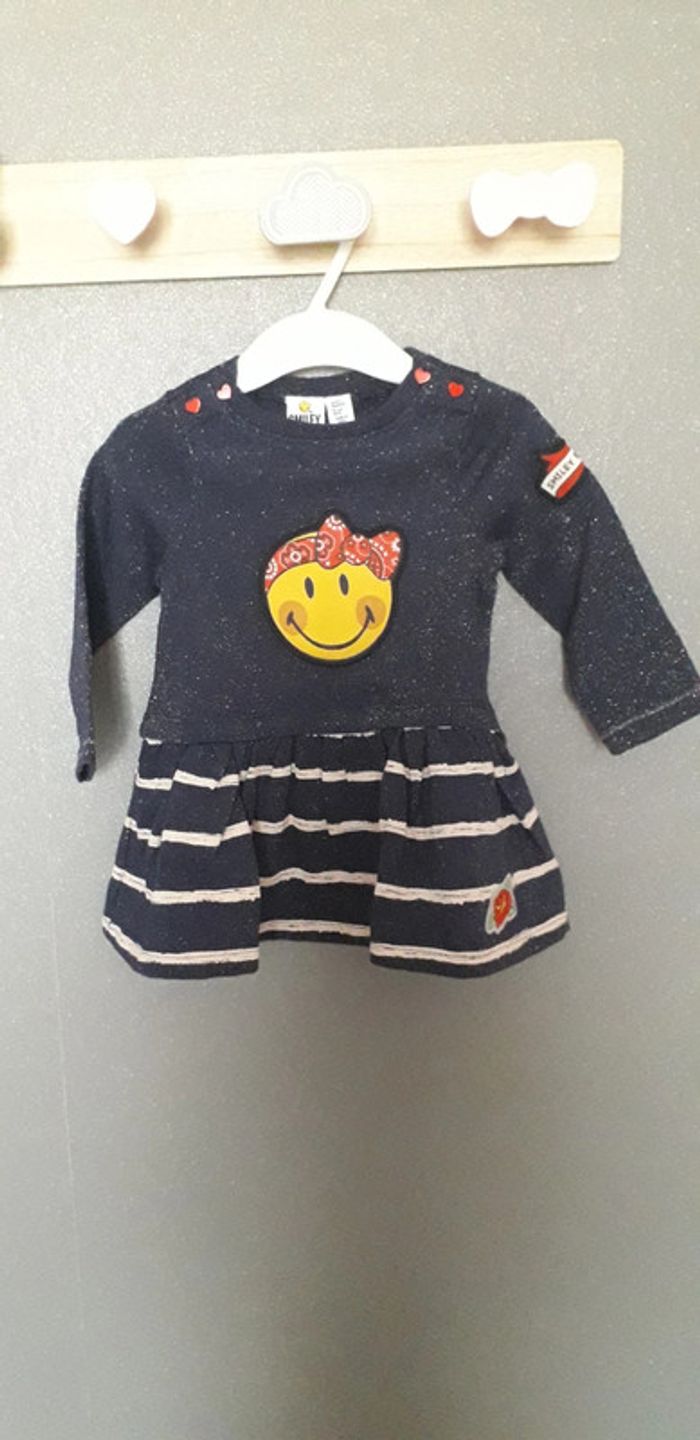 Robe manches longues 9 mois Smiley baby Neuve Bleu marine pailleté Motif smiley sur le devant Bas de la robe rayé Très jolie portée. Malheureusement ma fille n a pas eut le temps de la mettre #lily2905fille9mois