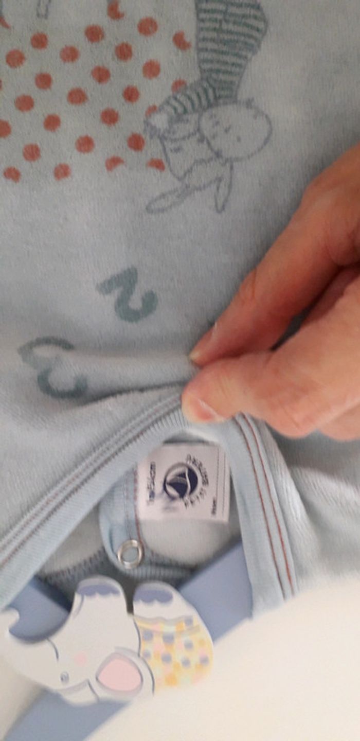 Porté une fois, comme neuf Juste une initiale marquée sur l étiquette (cf photo) Velours bleu ciel et blanc Petit bateau 1 mois Garçon ou fille #lily2905bébémixtedu0au18mois