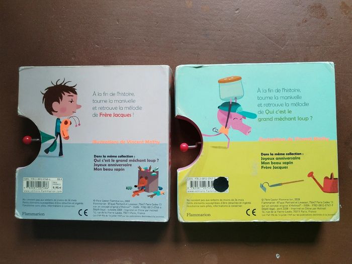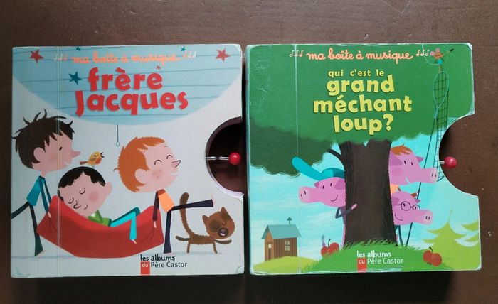 Très original, des livres avec une boîte à musique intégrée : Frère Jacques Qui est le grand méchant loup ? Bon état. Fonctionne très bien.