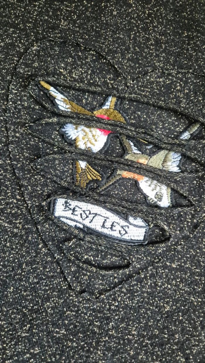 Sweat / pull col rond fin. Noir avec des fils doré / or. Faussement déchiré sur le torse pour laisser apparaître un patch avec des oiseaux. Très sympa porté, confortable, va avec tout. Taille 11 / 12 ans de chez Name It. #nameit #fille12ans #dressingdedihya12ans