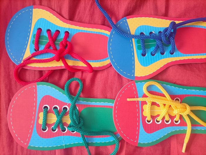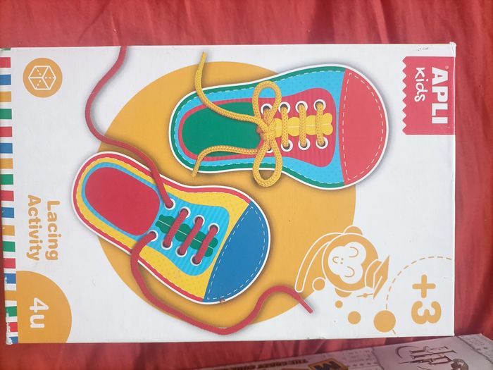 En carton pas neuf mais peut encore servir pour apprendre à faire les lacets très utiles pied gauche et droit peut être utilisé par deux enfants en même temps