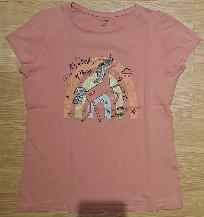 Vends un joli t-shirt de couleur pêche avec une licorne dessus en 12 ans propre, lavé, repassé 2 E