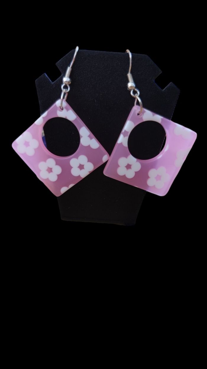 Boucles d'oreilles fantaisie, argenté, pendantes carré rose à fleurs. Hauteur : 6 cm