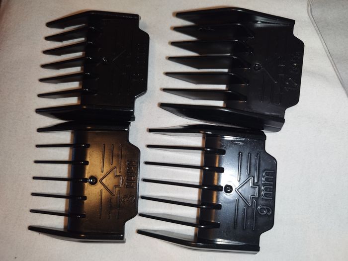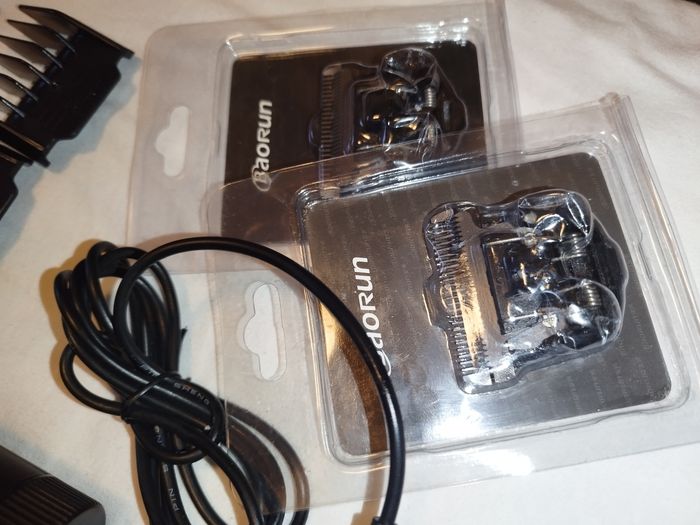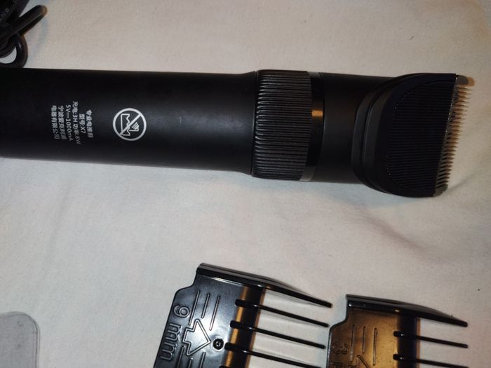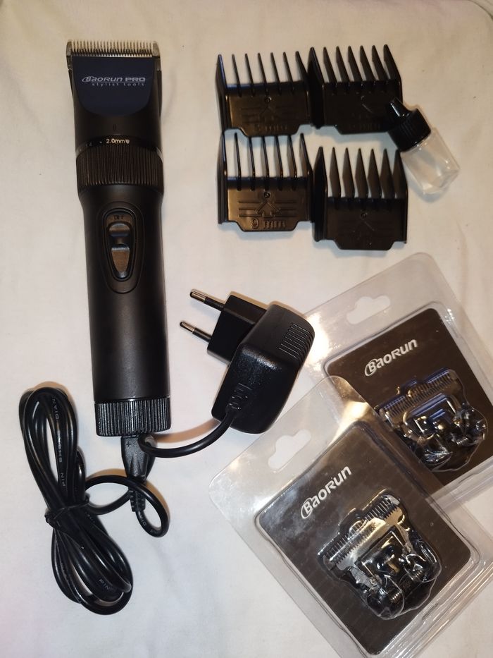 Neuve, jamais utilisée (j'en avais déjà une donc pas l'utilité d'une seconde), ainsi que tous ses accessoires neufs. Il n'y avait pas de boîte ni de manuel fournis. Batterie Lithium 2000 mAh. Chargeur tension 100V-240 V. 2 têtes de tonte sous emballage,lames en titane. 4 peignes fournis : 3 mm, 6 mm, 9 mm, 12 mm. Petite brossette + un petit récipient avec de l'huile.