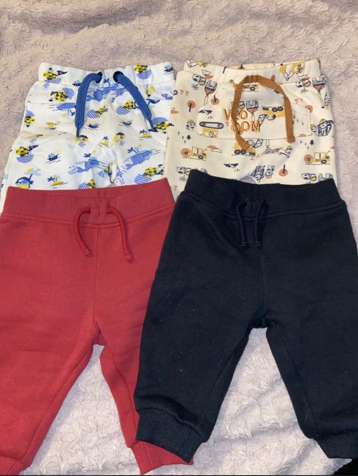 Lot de 4 joggings En bon état le rouge et noir ont des petites bouloche sur le bas du au lavage mais reste très discret (voir dernier photo) Différentes marquages de taille mais correspondent tous à du 3 mois. - le rouge et noir taille 0-3 mois - le beige 2-4 mois - le bleu 3 mois