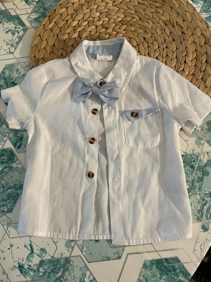 Chemise en très bon état Portée 1x pour un baptême. J’ai également le short 🩳 bleu clair qui va avec Taille 12/18 M